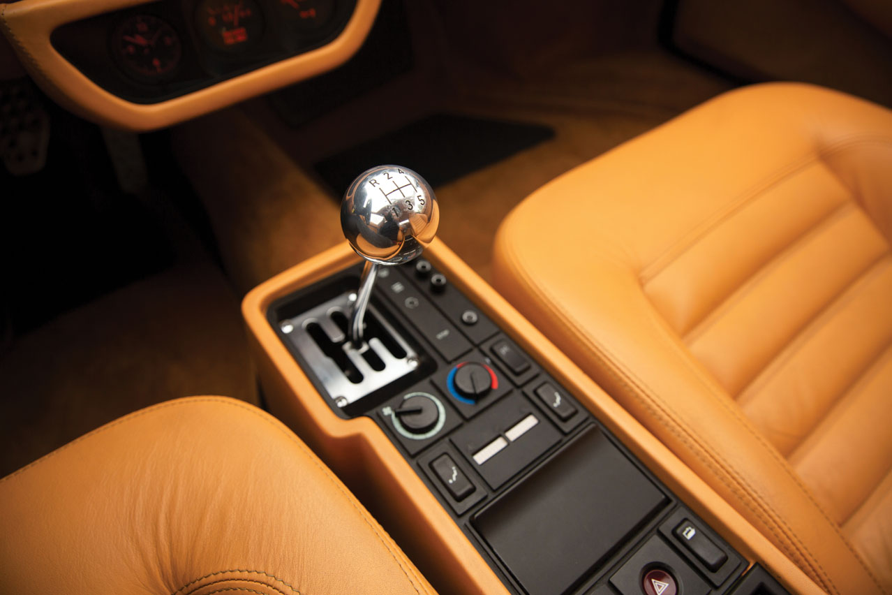 cambio del Ferrari 512 TRSientes que estás muy cerca del suelo y en cuanto das vida al motor V12 todo el interior se inunda de un sonido contundente. El cambio de marchas está mejor ubicado que en el Testarossa y por supuesto con la clásica parrilla en H. Solo insertar la primera ya hace que te salga una sonrisa en la boca. El embrague es duro pero aceptable, al igual que el resto de pedales. Nada, absolutamente nada que ver con la dureza salvaje del F40.