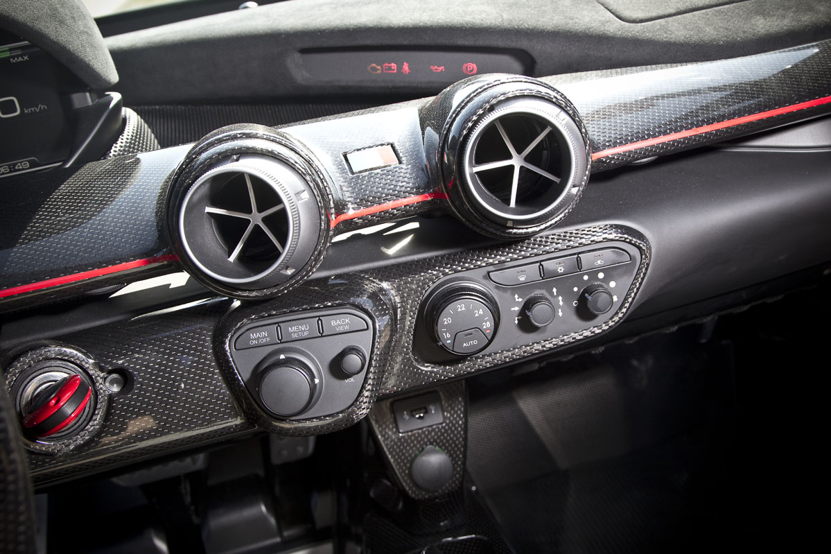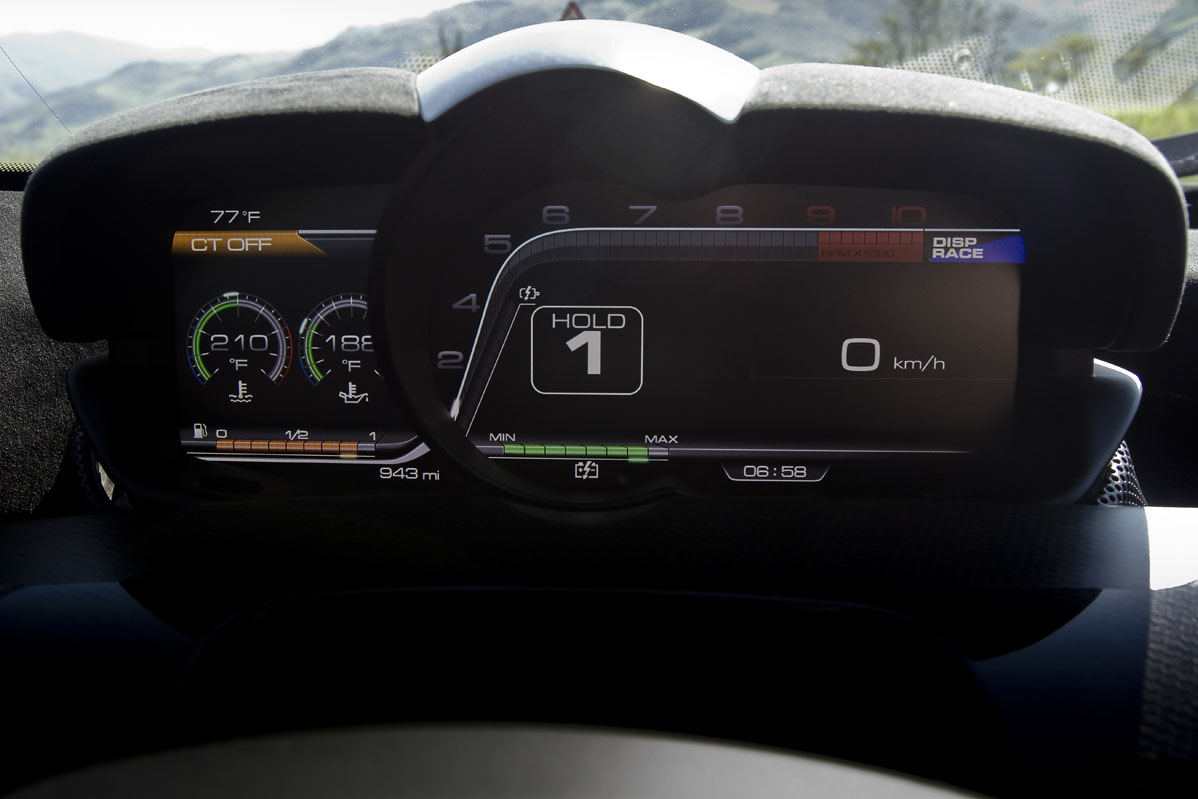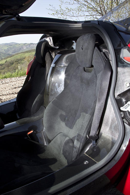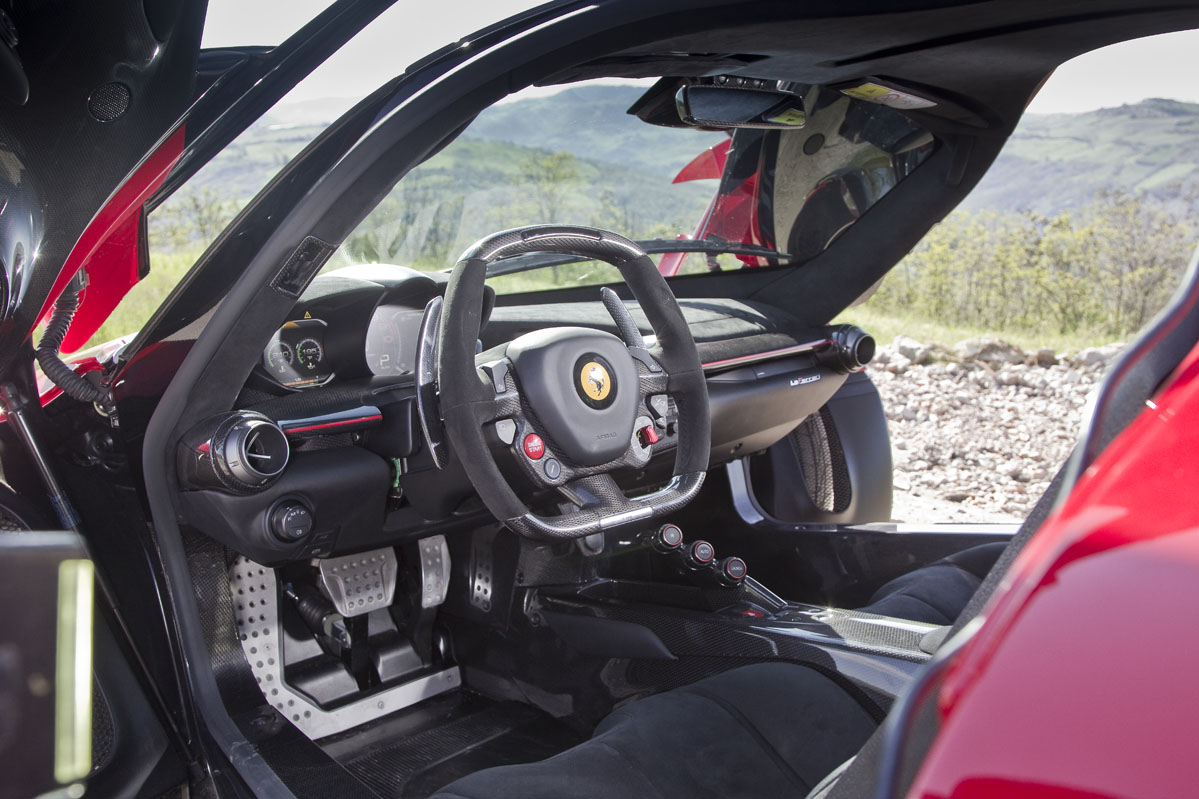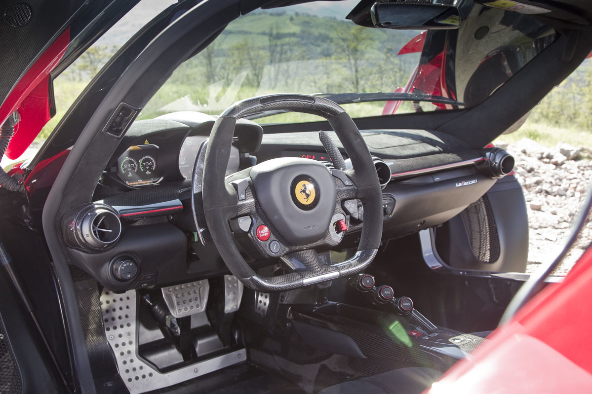La cabina, como era de esperar, es un lugar de aspecto exótico que resulta más pequeña e íntima de lo me imaginaba a pesar de que hay 30 mm extra de altura al techo que en un Enzo, con la idea de poder acomodar a los usuarios que utilicen un casco. Y eso se debe principalmente a que la posición de conducción es muy baja, con un asiento fijo y regulaciones tanto en el volante como en los pedales de acelerador y freno.