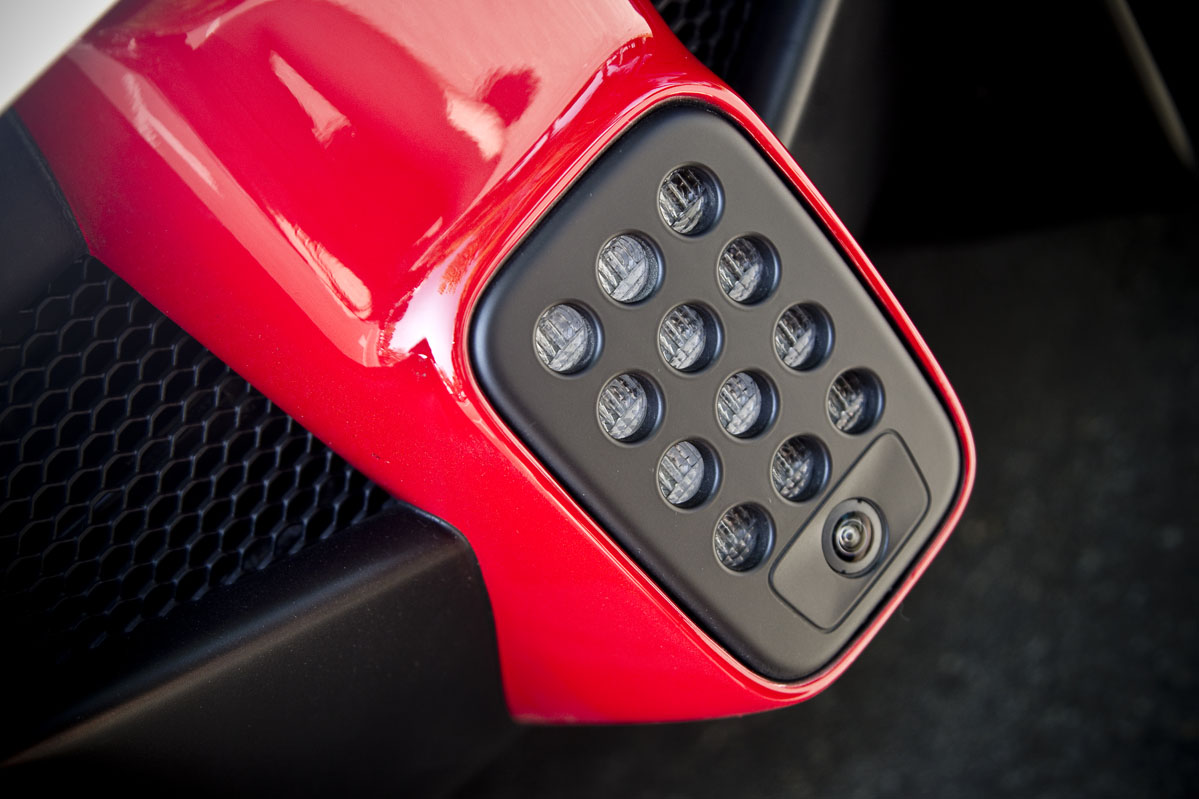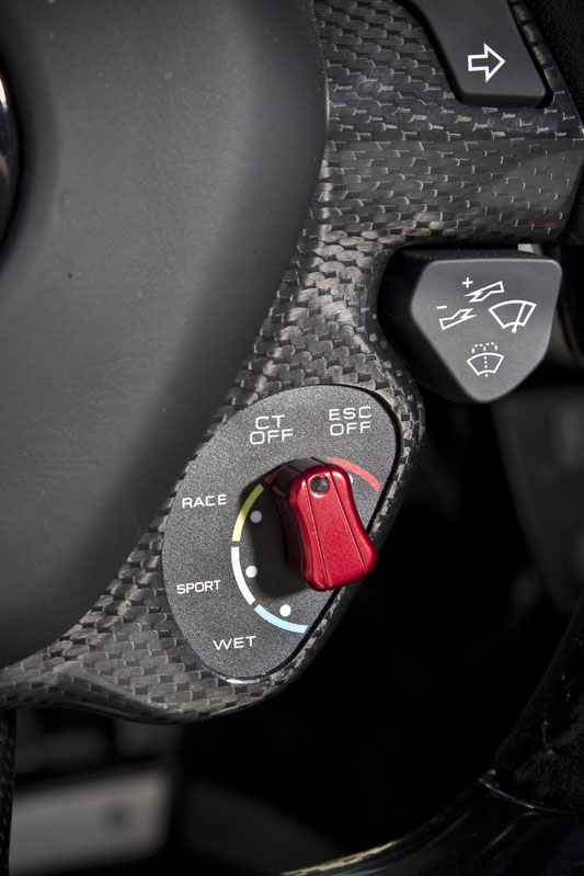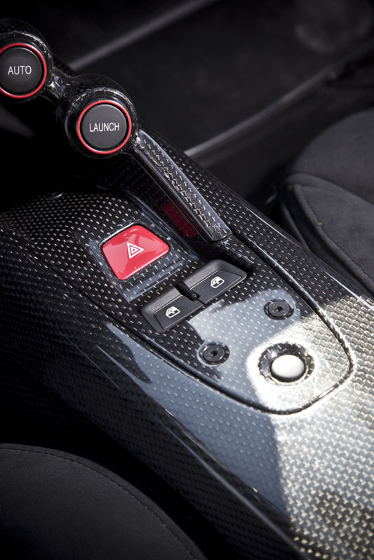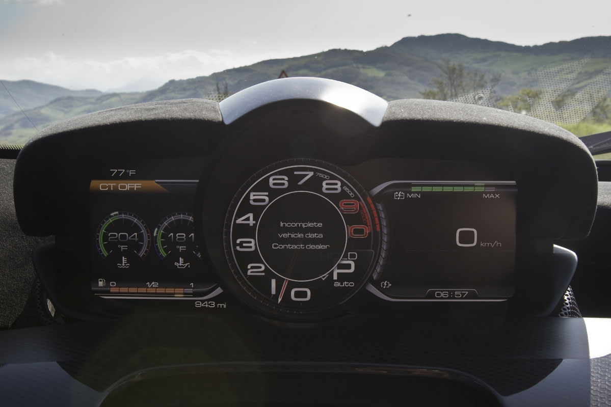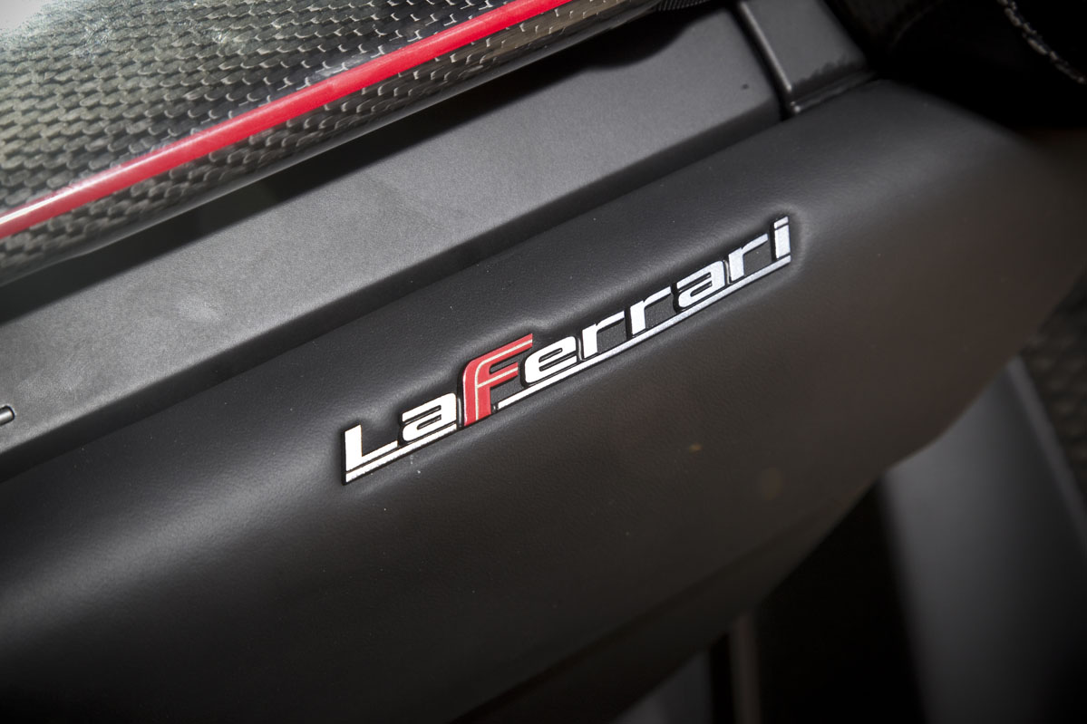 La cabina, como era de esperar, es un lugar de aspecto exótico que resulta más pequeña e íntima de lo me imaginaba a pesar de que hay 30 mm extra de altura al techo que en un Enzo, con la idea de poder acomodar a los usuarios que utilicen un casco. Y eso se debe principalmente a que la posición de conducción es muy baja, con un asiento fijo y regulaciones tanto en el volante como en los pedales de acelerador y freno.