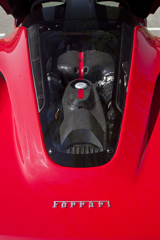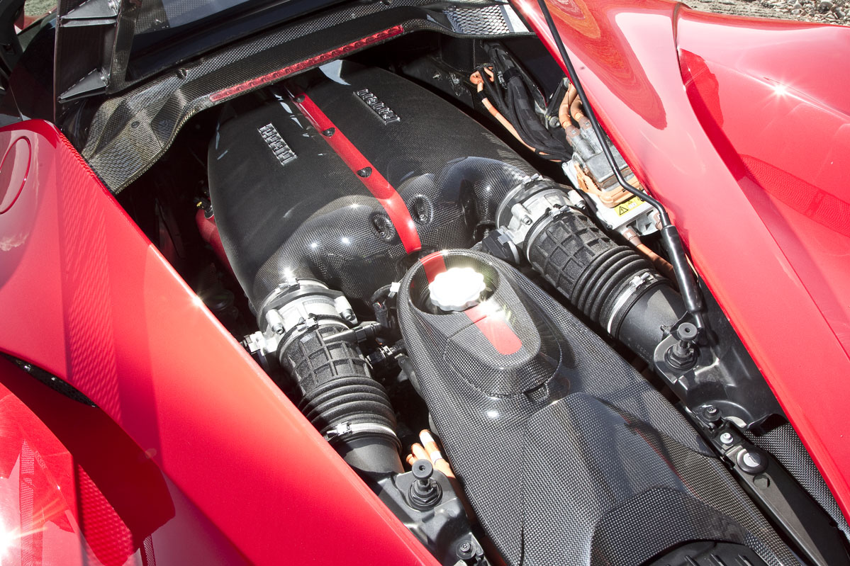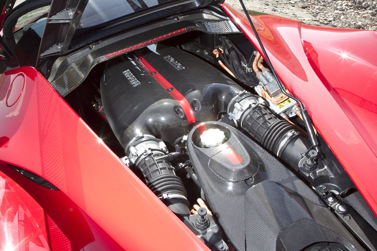 En el centro de este automóvil, justo detrás de los dos asientos fijos de fibra de carbono, se encuentra un motor V12 de 6.262 cc de aspiración natural. Genera 800 CV de potencia a 9.000 rpm y 700 Nm de par motor a 6.750 vueltas. Estas cifras por sí solas son suficientes para hacer que el LaFerrari sea más potente que el último Fórmula 1 de la Scuderia con motor V12, el 412T de 1995. Pero hay más: debajo de los asientos se encuentra una batería de iones de litio de 60 kg que, junto a un motor eléctrico de 25,7 kg, proporciona 163 CV y 270 Nm adicionales. Así, la cifra combinada alcanza unos increíbles 963 CV y 970 Nm.