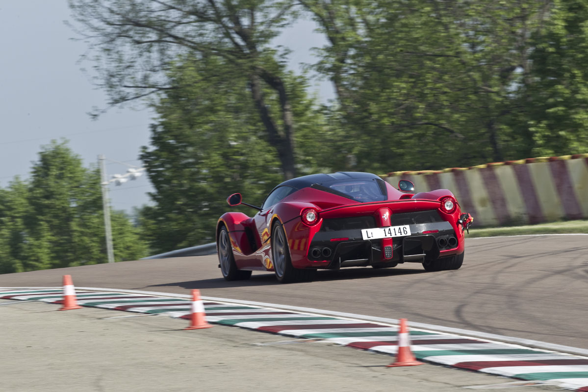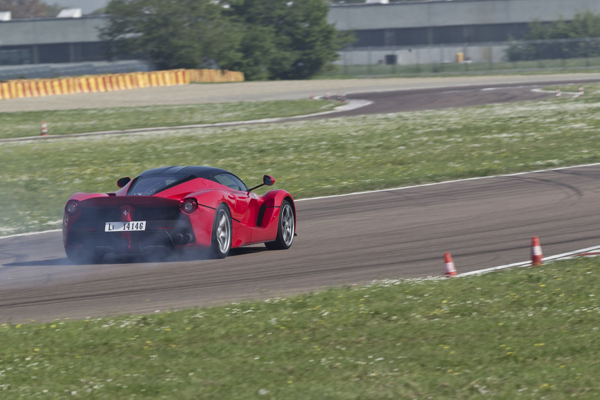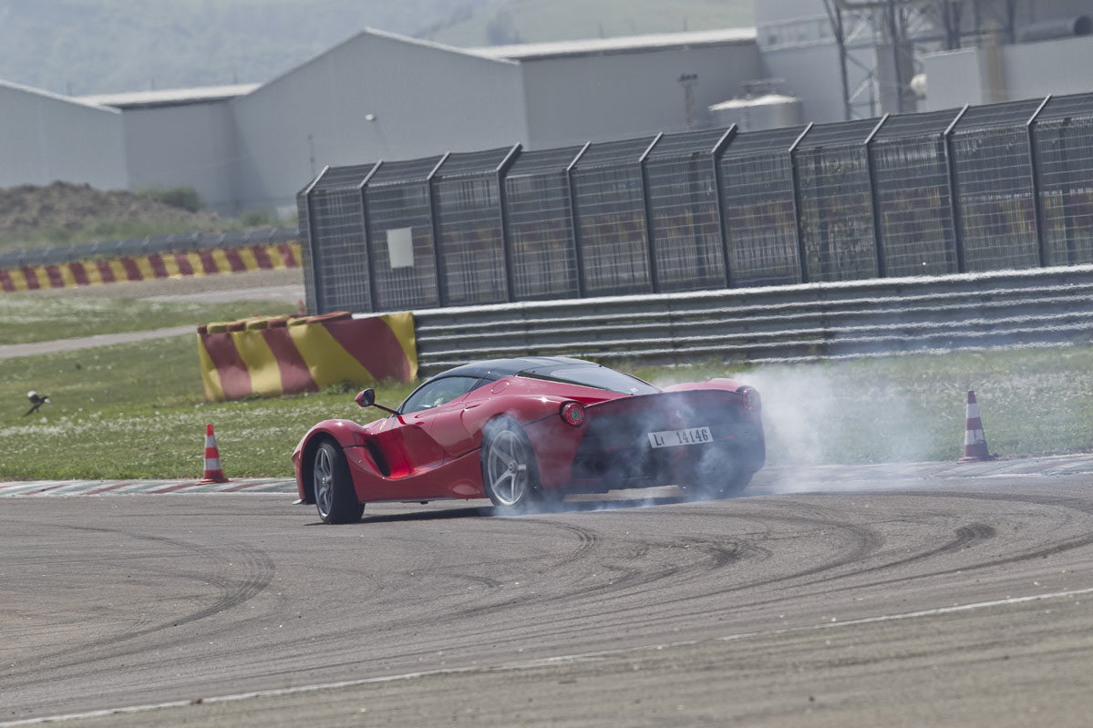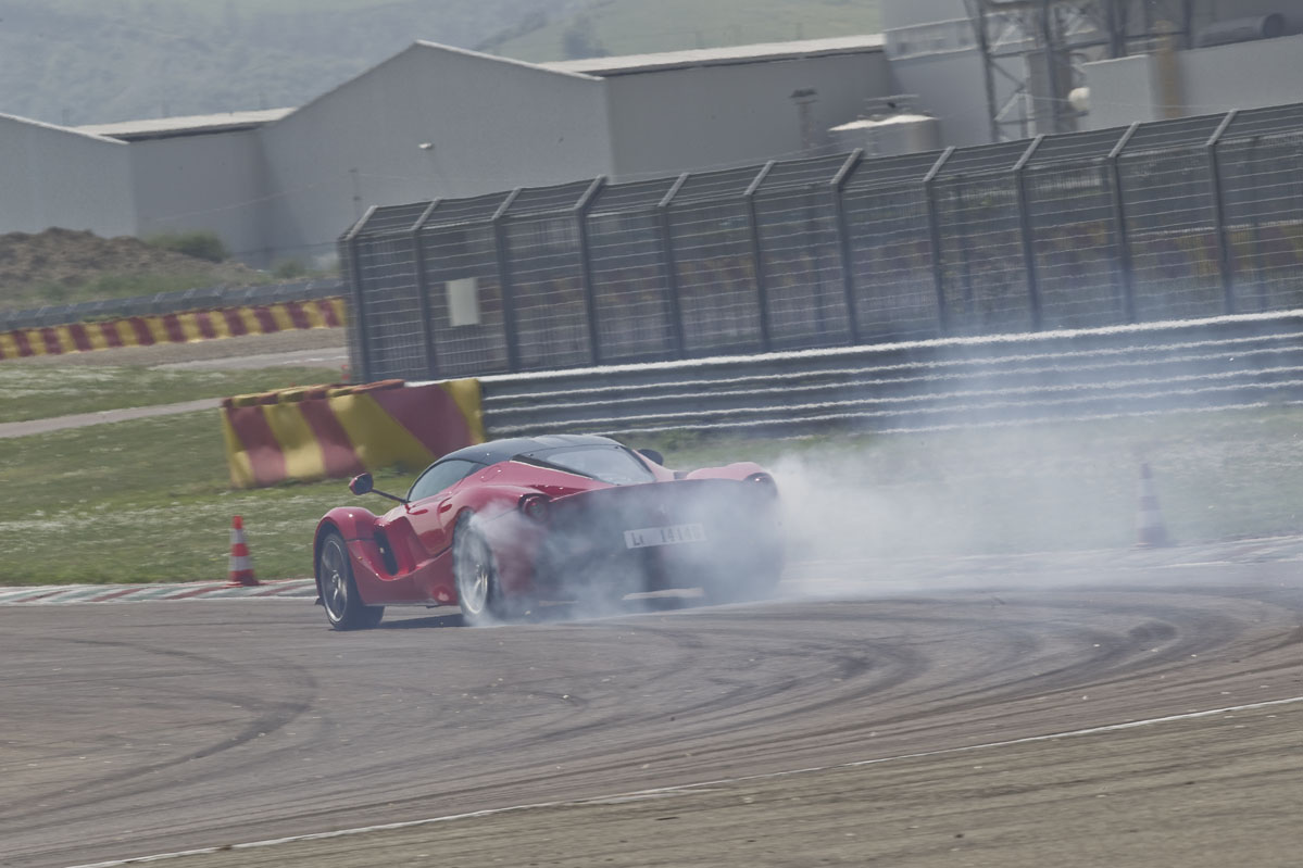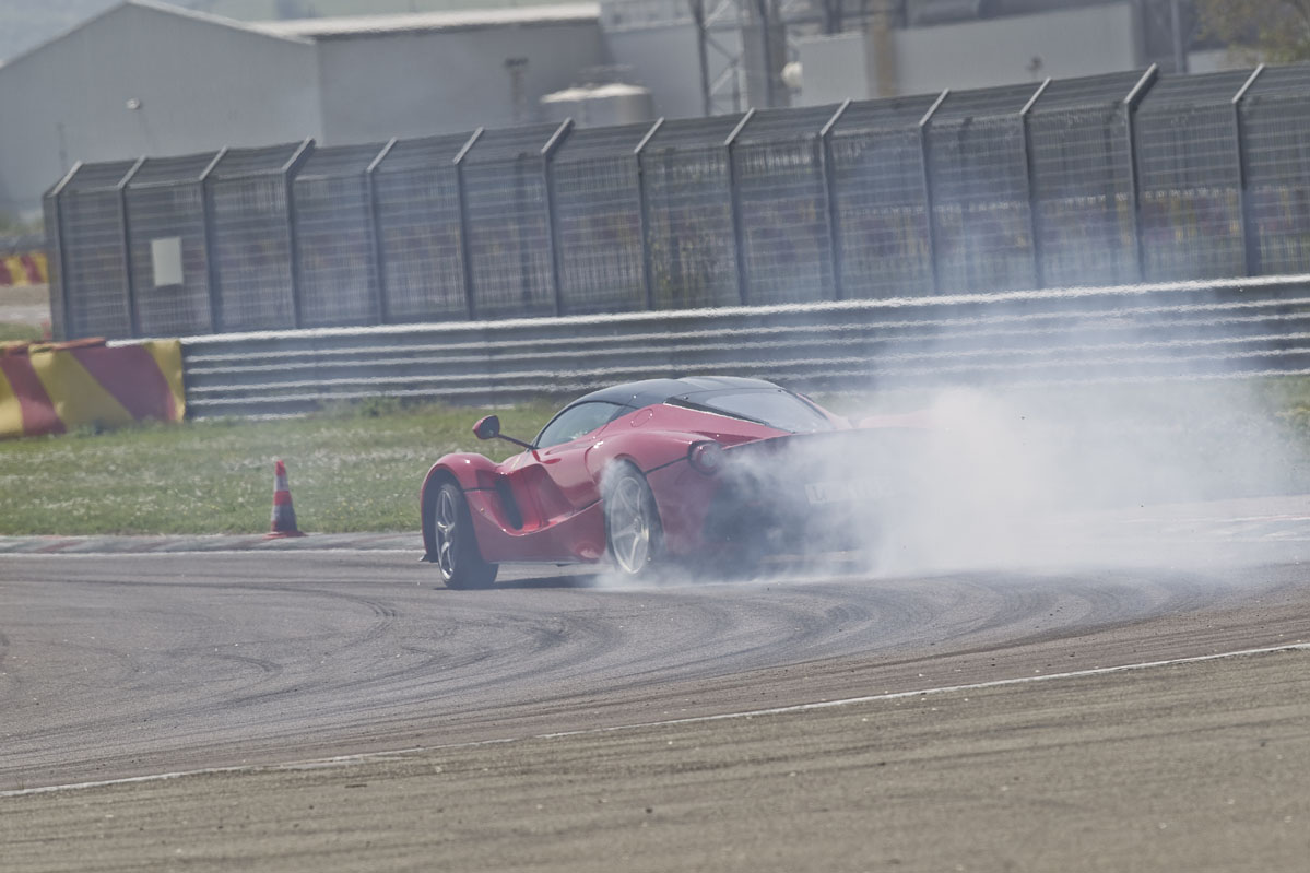 Lo que sucede a continuación es simplemente ridículo y tiene su miga. Completamos dos vueltas a tope, durante las cuales resulta evidente que el LaFerrari es (A) extremadamente rápido en línea recta, (B) que se detiene todavía mejor de lo que acelera, (C) que suena incluso mejor de lo que anda o frena y (D) que es capaz de proporcionar mucho agarre. Pero a mitad de la primera vuelta ya he tenido suficiente, especialmente cuando Simone roza uno de los conos que marcan la salida de una sección súper rápida con eses, lo que produce un sonido tremendo en la puerta del pasajero, a tan solo unos centímetros de mi oído derecho.