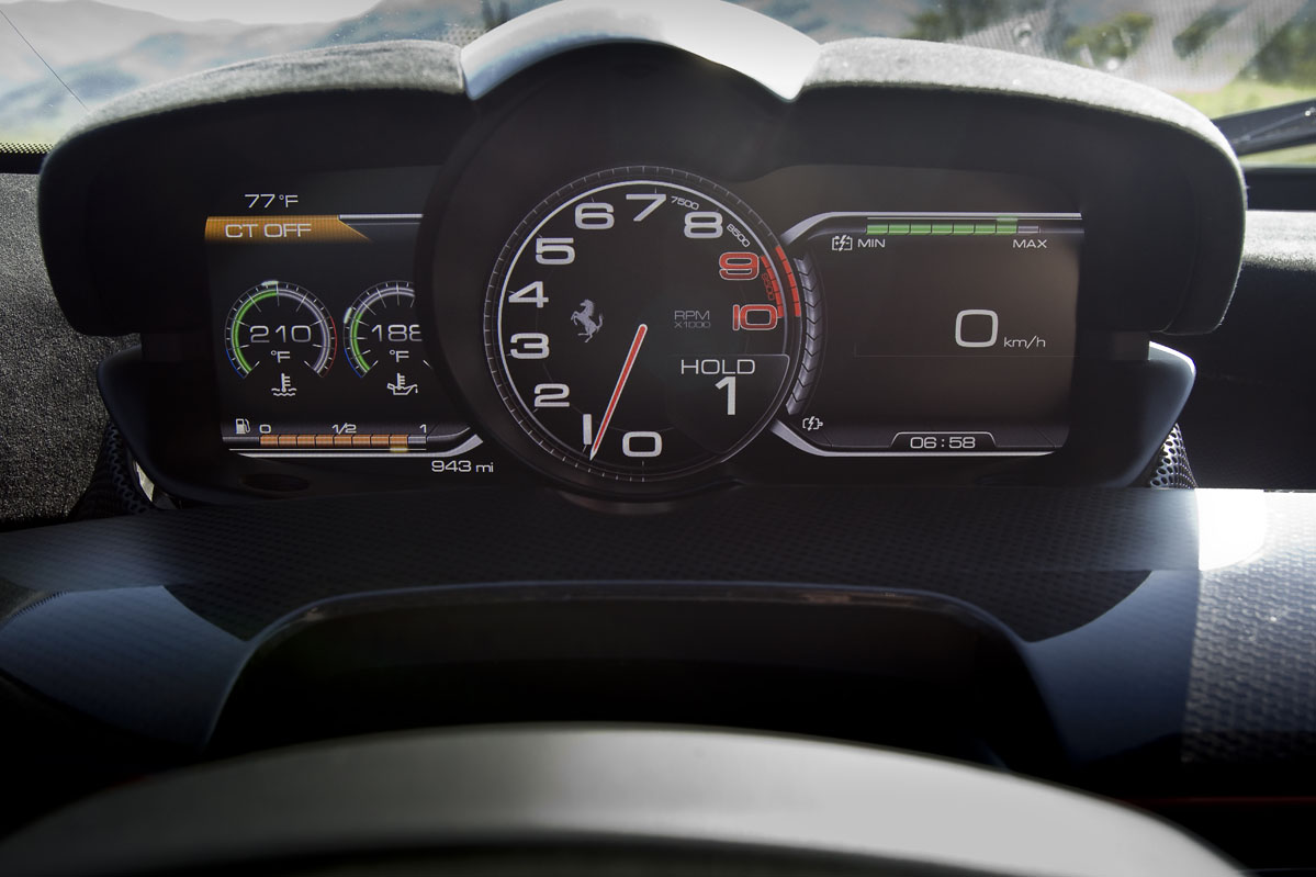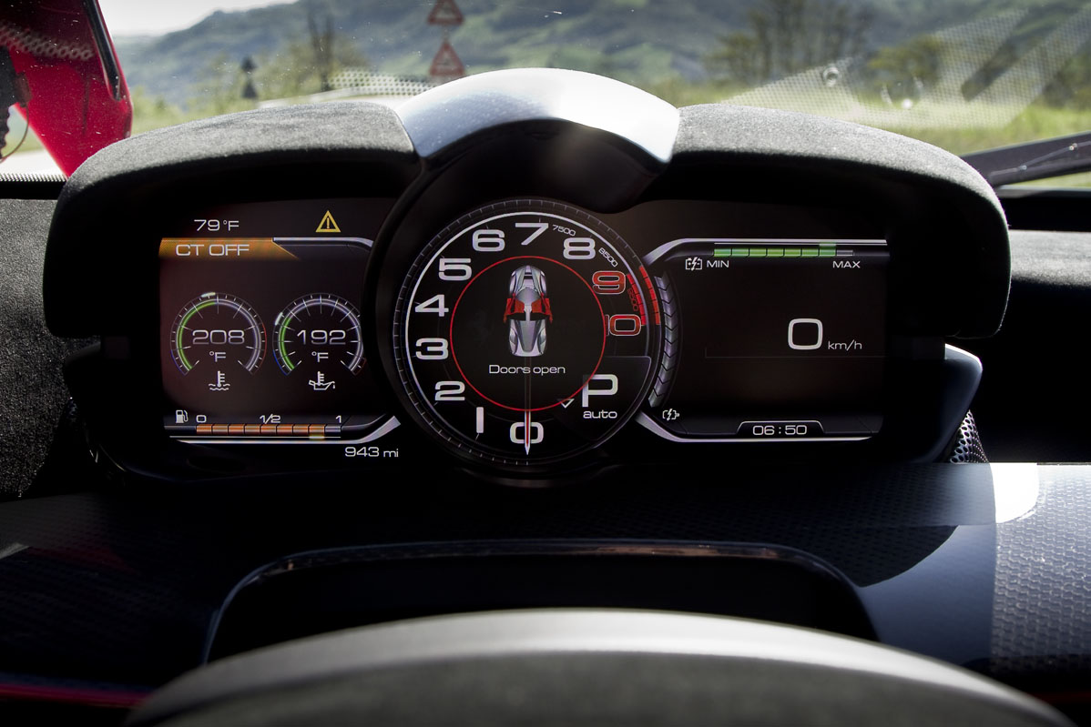 Y el resto de la cabina está en la misma línea. Hay tres estilos de instrumentación diferentes disponibles para la pantalla digital de TFT del cuadro de mandos, dominados en todos los casos por el cuentarrevoluciones. Cualquier persona que se haya subido a bordo de un 458 reconocerá ciertos elementos de inmediato, pero hay una sensación de pureza dentro del LaFerrari que lo eleva por encima de cualquiera de otros modelos de Maranello. Es como si estuvieras sentado dentro de un bólido de Le Mans pero muy bien equipado, con franjas de Alcantara y botones para la navegación por satélite donde esperarías encontrar interruptores con la leyenda ‘Lluvia’ o ‘Limitador de velocidad para pitlane’.