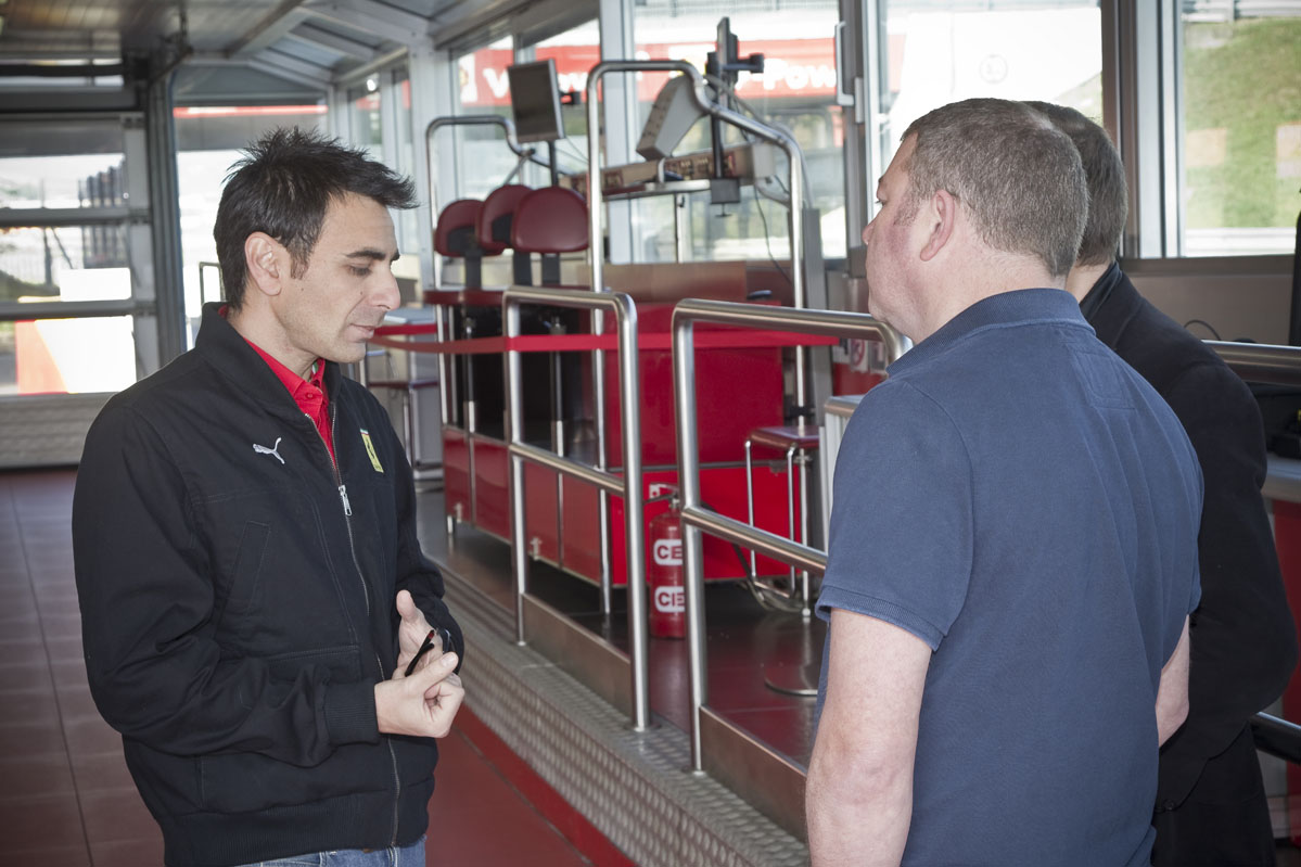 Recuerda que todo esto sucede cuando no hemos completado ni una vuelta. Y no es nada comparado con lo que pasa cuando pisa el freno ante la llegada de la primera curva. Momentáneamente quedo ‘colgado’ de los cinturones de seguridad y, mientras aprieto los dientes, suelto un improperio bastante predecible. En ese momento, Simone me mira, sonríe y me dice que todo está controlado. Un “confía en mí” seguido de un “¡confía en el coche!”.