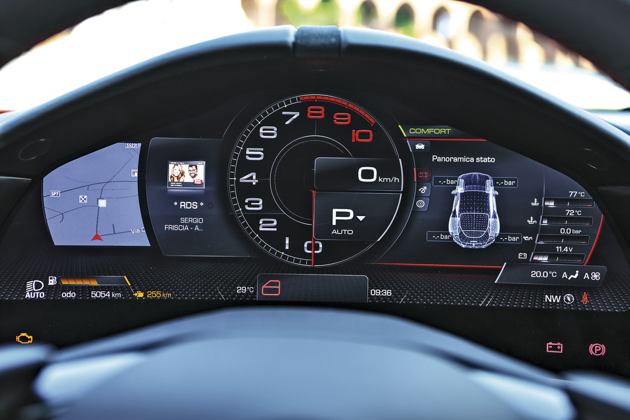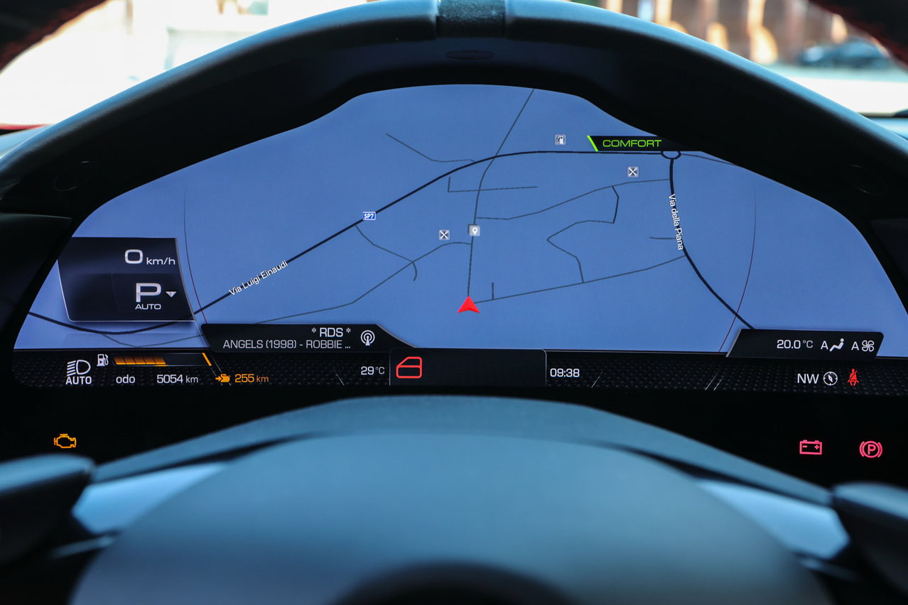 No es como subirse a un Porsche 911, donde puedes encontrar una calidad brutal pero también un ambiente más frío y sobrio. Aquí, desde que arrancas, te sientes en una atmósfera muy deportiva. Insertar la primera con la enorme leva de carbono te deja claras las intenciones del coche.