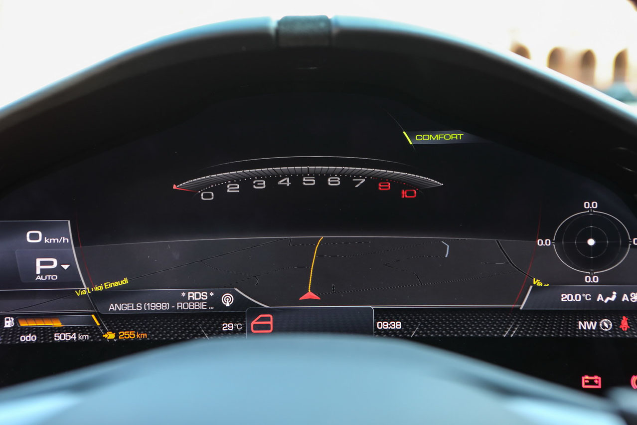 Y es que este coche tiene, como poco, dos caras. La primera es amable: con el Manettino en posición de lluvia o incluso en posición normal es un coche dócil. Puedes abusar del pedal derecho y no sentirás grandes pérdidas de tracción. Además, si decides ir tranquilo y con la transmisión en modo automático podrás viajar la mar de relajado.