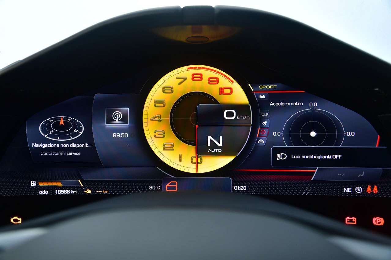 Esto significa que entre las 3.000 y las 7.500 vueltas el motor nunca desfallece y siempre empuja como un desesperado. Todo esto está aderezado por la maravillosa transmisión Ferrari F1-DCT de siete relaciones y cuyo punto álgido se alcanza cuando decides utilizar las fantásticas levas de fibra de carbono ancladas en el túnel de dirección.