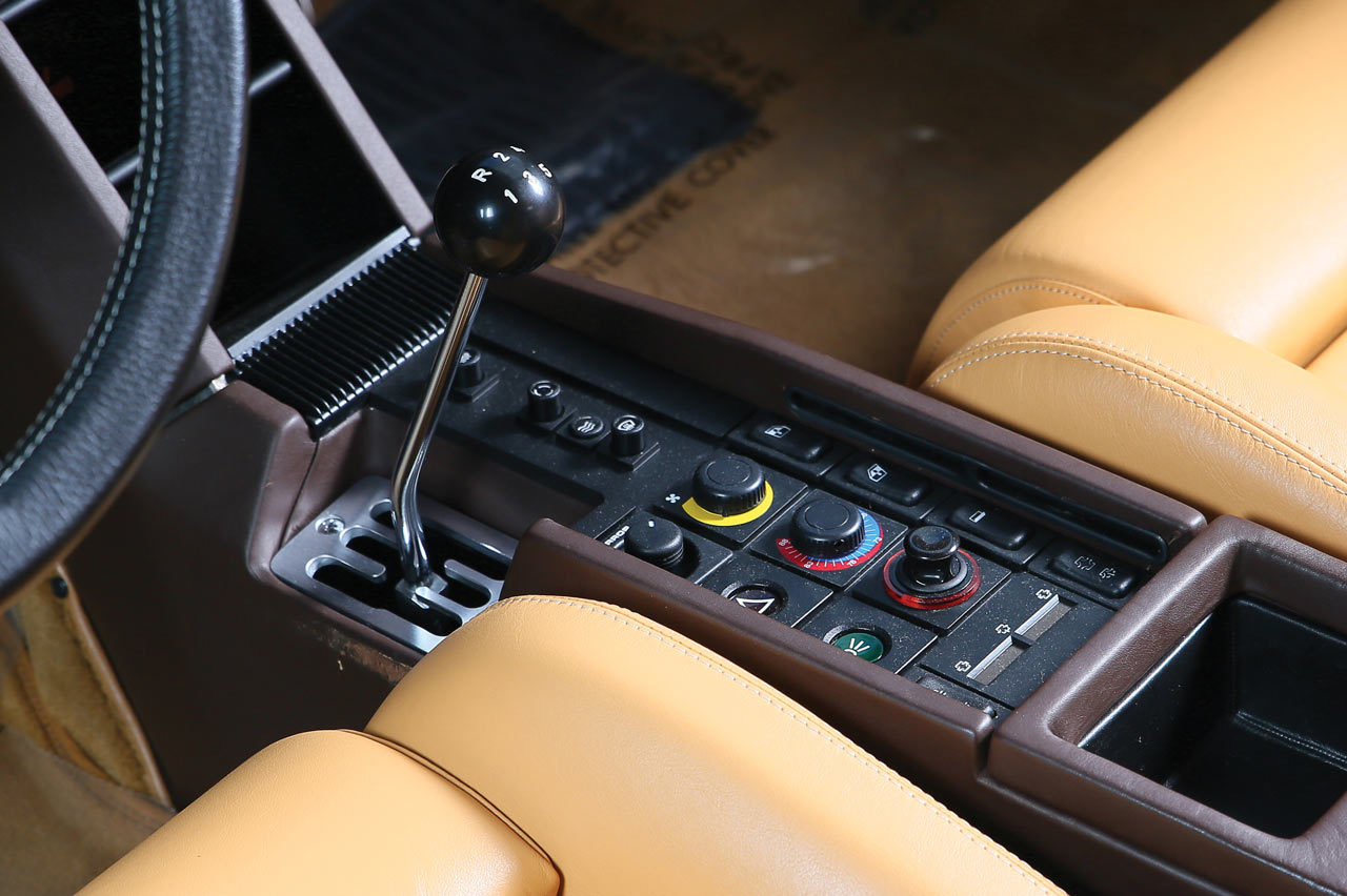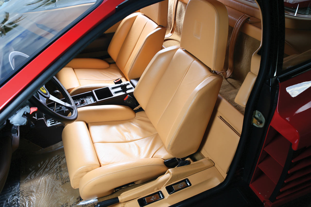 No falta la rejilla en H típica de la marca –el Testarossa no contó con cambio automático ni en opción–, que da servició a la caja de marchas tipo 'dog leg', con la primera hacia atrás. Esta disposición se considera más deportiva por ser típica de las carreras, ya que favorece los cambios de 2º a 3ª y viceversa, muy comunes en competición. En el túnel central, también encontramos numerosa botonería correspondiente a los elevalunas, el aire acondicionado y demás. Curiosamente, en el techo se sitúan, además de las luces de cortesía, las luces antiniebla y la luneta térmica. Aunque para extraña, la ubicación de los ceniceros, que van en las puertas. Y es que entonces, aún se fumaba en los coches. El freno de mano, como era habitual en la época en Ferrari, está a la izquierda, junto al estribo de la puerta, donde encontramos los tiradores para abrir el capó trasero y el maletero, situado delante y en el que hay espacio para el equipaje de dos personas para un fin de semana. En su momento, la marca italiana sitúo en la parte superior de la piña del volante el número de chasis.