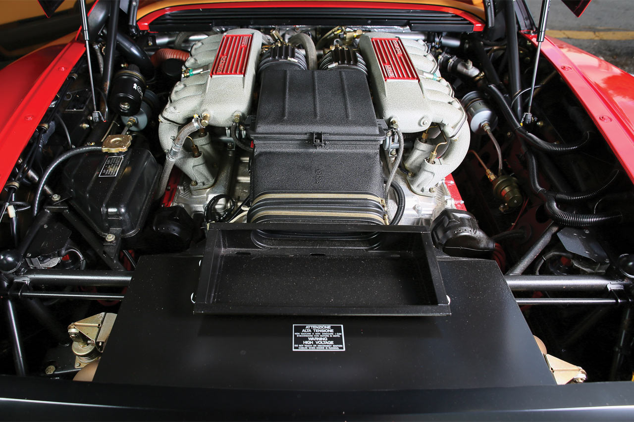 Y ya que hablamos de motores, el Testarossa heredaba del 512 BBi su V12 a 180º de 4.943 cc, ahora con código interno F 113 A 000 y fabricado en aleación ligera, lo que permitía ahorrar 20 kilos. Además, mientras en la BB tenía dos válvulas por cilindro, en este caso eran cuatro, las de admisión de acero y las de escape de una aleación de níquel y cromo denominada Nimonic. Estaban actuadas por cuatro árboles de levas. Contaba con una inyección mecánica Bosch K-Jetronic, mientras que la electrónica corría a cargo de Magnetti Marelli. La cifra de potencia final alcanzaba los 390 CV a 6.300 rpm, con un par máximo de 490 Nm que se lograba a 4.500 vueltas.