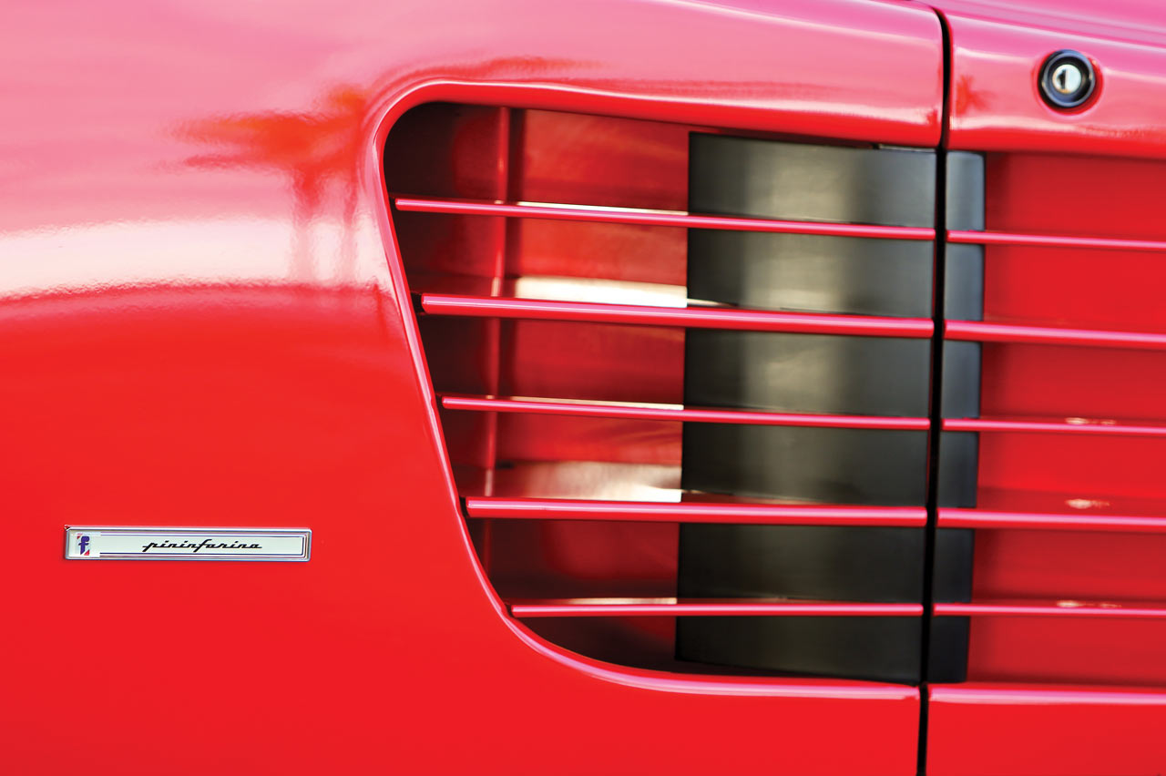 Exteriormente, el elemento estético más reconocible y característico de su diseño eran las enormes tomas de aire laterales, que servían para surtir de aire a los dos radiadores situados en ambos lados del coche, al más puro estilo de los monoplazas de Fórmula 1. Aquí Pininfarina se encontró con un problema, la legislación USA, que prohibía las tomas de aire por las que pudiera colarse ¡una persona! La solución fue montar unas lamas horizontales que acabaron por definir sus inolvidables formas. Igualmente característico resultaba el espejo retrovisor izquierdo situado en la parte superior del montante delantero y sin réplica en el lado derecho. Original, pero poco práctico, hasta el punto que la propia Ferrari decidió colocar, en 1987, dos retrovisores en una posición convencional. En todo caso, aquellos primeros Testarossa 'monospecchio', son hoy en día los más buscados y cotizados. El exterior se remataba con unas llantas de cinco palos monotuerca que terminaban por configurar una imagen redonda. ¿Redonda?