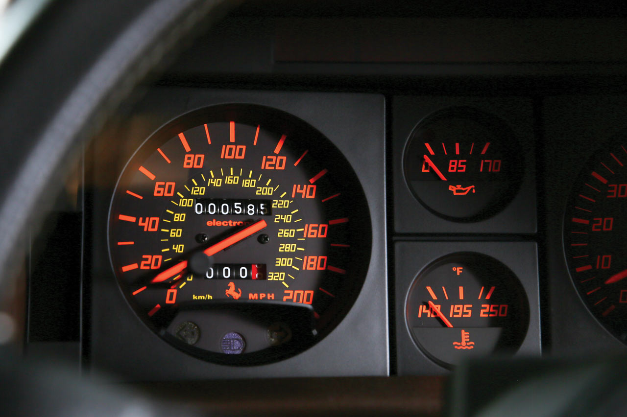 El modelo del Ferrari Testarossa que vamos a probar es una unidad de 1989, en color rojo –como debe ser en este deportivo– y con el interior en marrón y crema. Como vemos, las llantas ya montan cinco tornillos, pues las monotuerca se cambiaron en 1988. El habitáculo no es lo que llamaríamos un derroche de diseño, pues es más bien sobrio, aunque estamos rodeados de cuero por todos los lados, con los asientos en cuero Conolly. El volante es sencillo incluso en exceso, y a través del mismo vemos la capilla principal de relojes, con el velocímetro a la izquierda y el cuentavueltas a la derecha. Entre ellos, el de presión de aceite y la temperatura del motor. Ya en la consola central encontramos las lecturas de temperatura de aceite y el aforador, además del cuentakilómetros total y parcial y un cronómetro que nos sirve de recordatorio de que esto es un deportivo de raza.