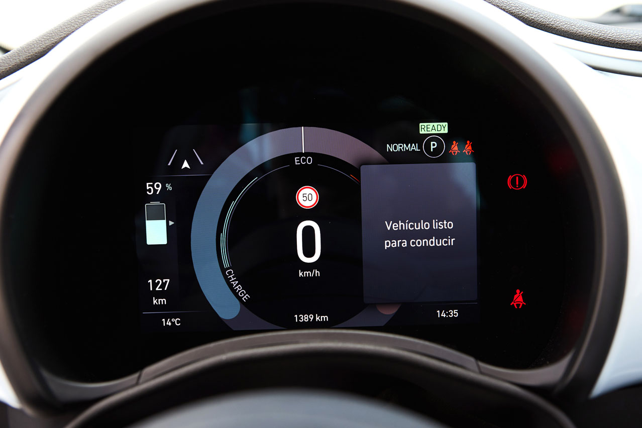 Además, como buen coche eléctrico tiene modos de conducción. En su caso son tres: Normal, Range y Sherpa. El primero, pues como su propio nombre indica... normal. El segundo retiene de una forma muy intensa, llegando a frenar, al soltar el acelerador, permitiendo conducir solo con el del acelerador, jugando y dosificando la intensidad con la que se pisa -la denominada conducción a un pedal-. Y el tercero limita la velocidad a 80 km/h y desactiva algunas de las funciones prescindibles. A este se añade uno, el modo Tourtle (tortuga), que espero que no te salte, porque querrá decir que la autonomía es menor de 24 kilómetros, limitándose aún más las funciones del coche y sin poder superar los 70 km/h.
