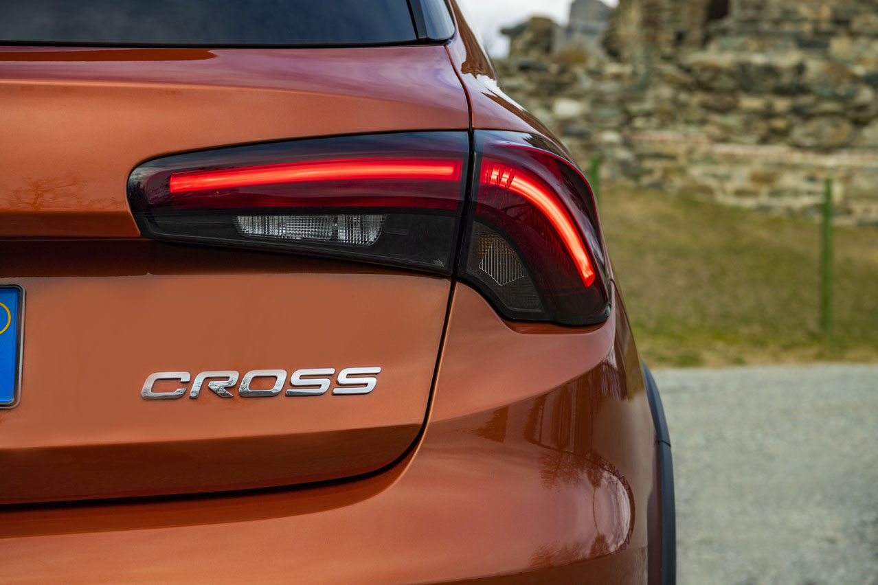 La versatilidad y la funcionalidad vienen de la mano en la nueva variante del coche de esta prueba, el Fiat Tipo Cross. Se trata de una versión más campera, tanto por imagen, gracias a sus protecciones en la parte baja de los paragolpes, a las molduras en negro de los pasos de rueda y a las barras de techo; como por altura, puesto que la carrocería está 37 mm más separada del suelo que la del Tipo convencional -también es 61 mm más alto debido a las barras-.