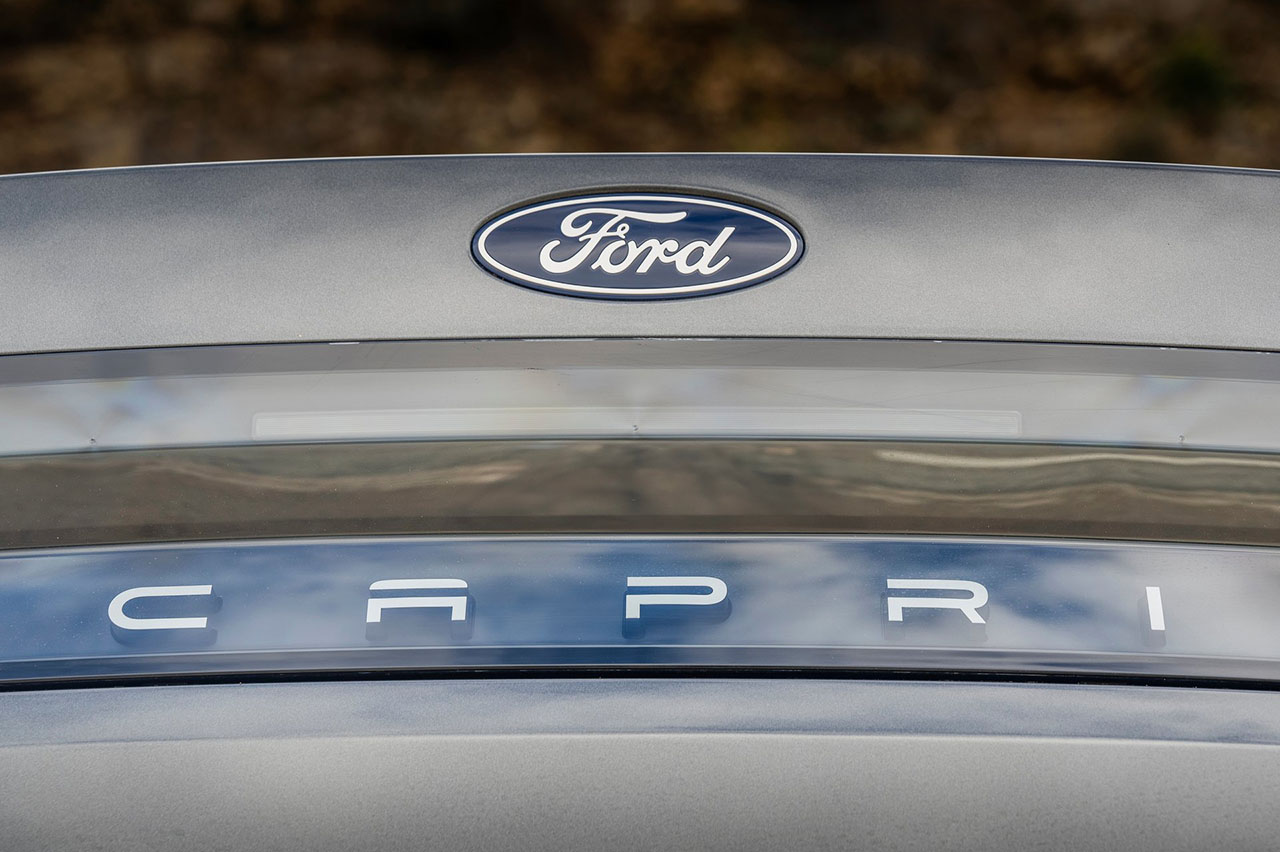 En términos generales podríamos decir que se trata de un Explorer de corte deportivo, ya que ambos se sostienen sobre la misma plataforma MEB del Grupo Volkswagen, de ahí que te hayamos dicho lo de la sangre alemana, en la que los diseñadores de Ford sí han querido imprimir el sello propio del Capri como se percibe en detalles como el frontal, con esta máscara en negro que conecta los pilotos delanteros que buscan esa forma cuadrada del Capri MK1; la línea del techo descendente en el pilar C en el que se deja ver esta forma redondeada del cristal de cortesía que evoca al MK1; una caída del techo que desemboca en una tapa del maletero cuadrada que también se cruza por una moldura en negro transparente que conecta los pilotos y en la que deja entrever el nombre del modelo.