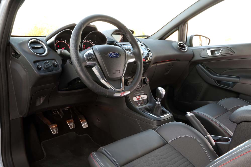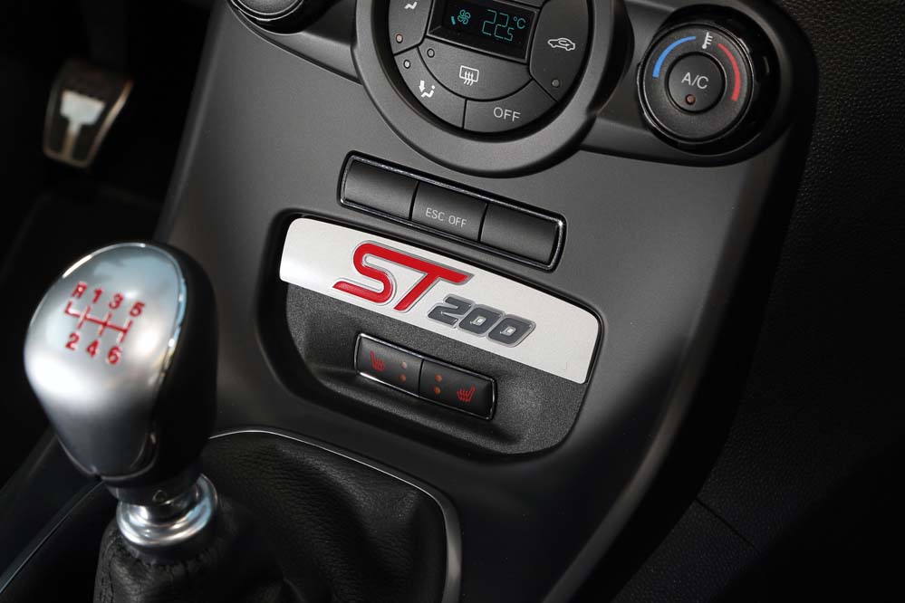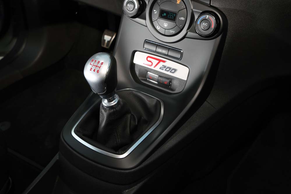 Pero hablemos de lo que realmente importa en esta prueba. El Fiesta ST200 ahora sí puede presumir de haber alcanzado la potencia de sus homólogos: los 200 CV. Éstos son exprimidos del conocido 1.6 EcoBoost que tanta satisfacción da a los clientes de la marca. Pero es que además de este incremento de caballería, que supone dos veces la ofrecida por el Fiesta XR2, para que veas como ha cambiado el asunto en 20 años, también se ha aumentado el par motor. Si antes era digno de mención, ahora es ‘cum laude’: 290 Nm desde 2.500 rpm y hasta las 4.000. Espera, que ahí no queda la cosa, porque para nuestra sorpresa, con la función ‘overboost’ suma 15 Nm más durante 20 segundos, por lo que las recuperaciones las realiza en un santiamén. Existe reprís incluso en sexta, por lo que no es necesario jugar con el cambio para una mayor demanda de energía. Entre tanta cifra no puede pasar desapercibida su aceleración de 0 a 100 km/h, que la realiza en 6,7 segundos, dos décimas más rápido que el ST convencional, y su velocidad máxima, 230 km/h, 10 km/h más que la versión sobre la que ha sido desarrollado. A ello contribuye el cambio manual de seis velocidades, que sigue siendo una delicia por su precisión y rapidez. Y es que ahora cuenta con un desarrollo final ligeramente más corto.