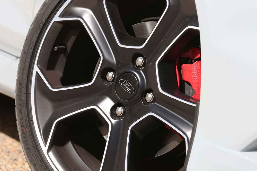 Me separan tres metros del Ford Fiesta más potente de toda la Historia, modelo que nada más y nada menos cuenta con 40 años a sus espaldas. Su estampa no exhibe ese gran honor, porque tampoco son muchos los elementos en su estética que lo diferencien de un ST; tampoco de un Fiesta con acabado Sport y llantas de 17 pulgadas. Eso sí, las de esta versión vienen en un acabado exclusivo: están bañadas en negro mate y sus extremos, también los de los brazos, pulidos. Asimismo, su carrocería 'viste' un traje color Storm Grey, única opción disponible.