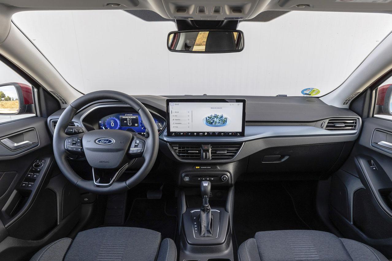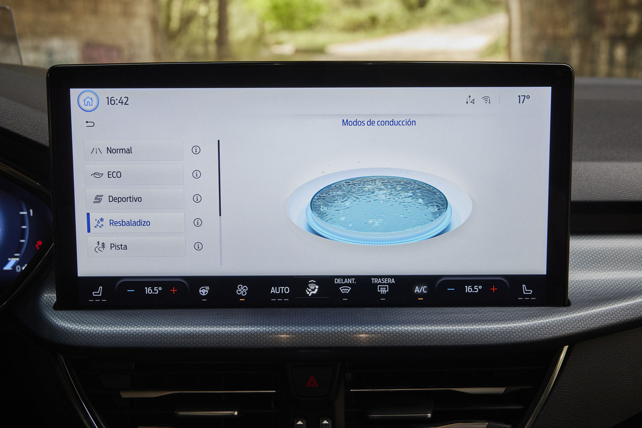 Donde más se ha notado este lavado de cara es en su interior. Lo primero que llama la atención es su enorme pantalla de 13,2 pulgadas, la más grande del segmento. Todo se controla desde ella, y su sistema SYNC 4 trae actualizaciones de software inalámbricas Ford Power-Up. Los menús son fáciles, pero los botones físicos han sido suprimidos, y cualquier acción como subir o bajar la temperatura o encender o apagar el climatizador se realiza desde la pantalla. Incluso activar la calefacción del volante.