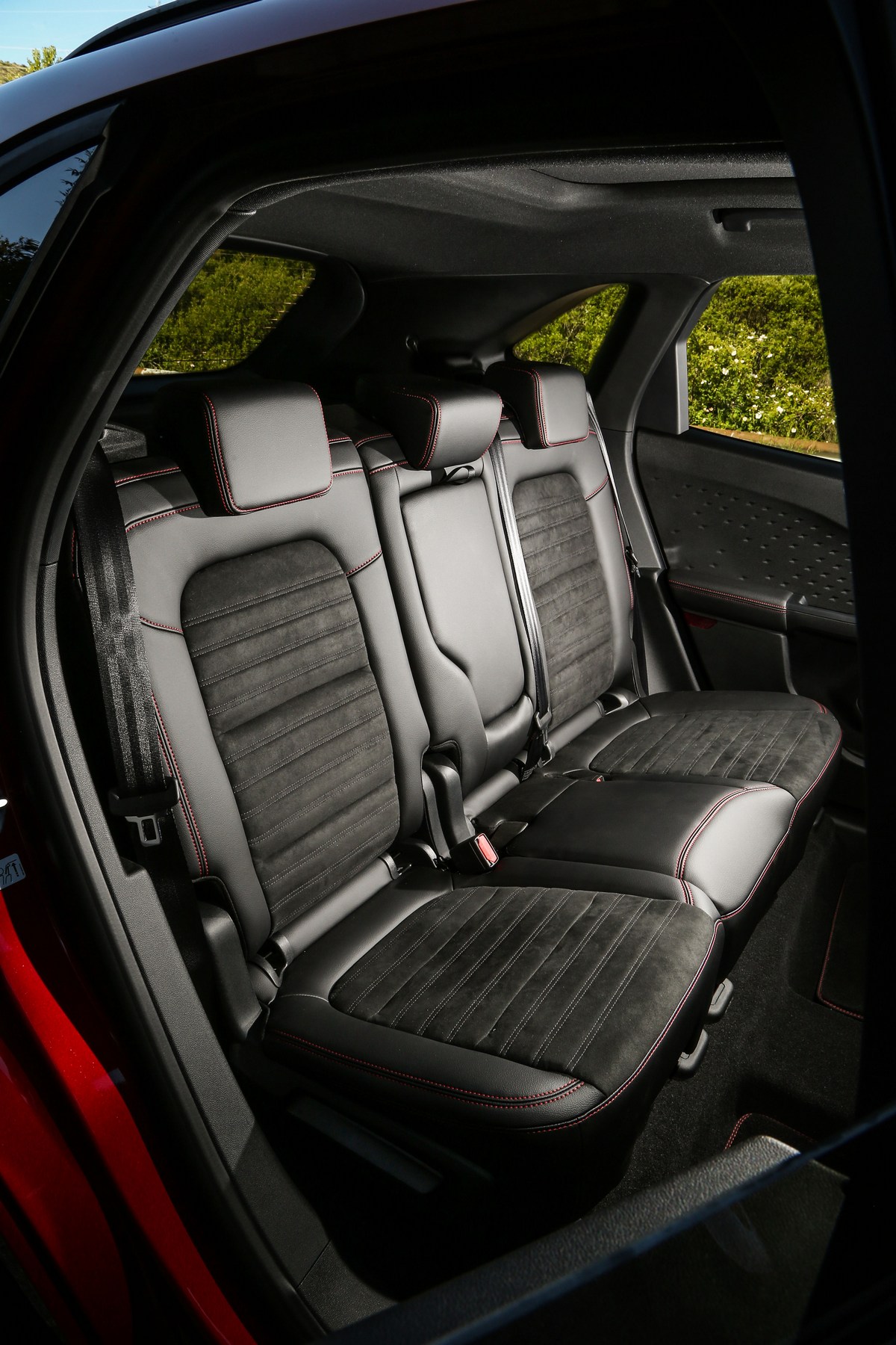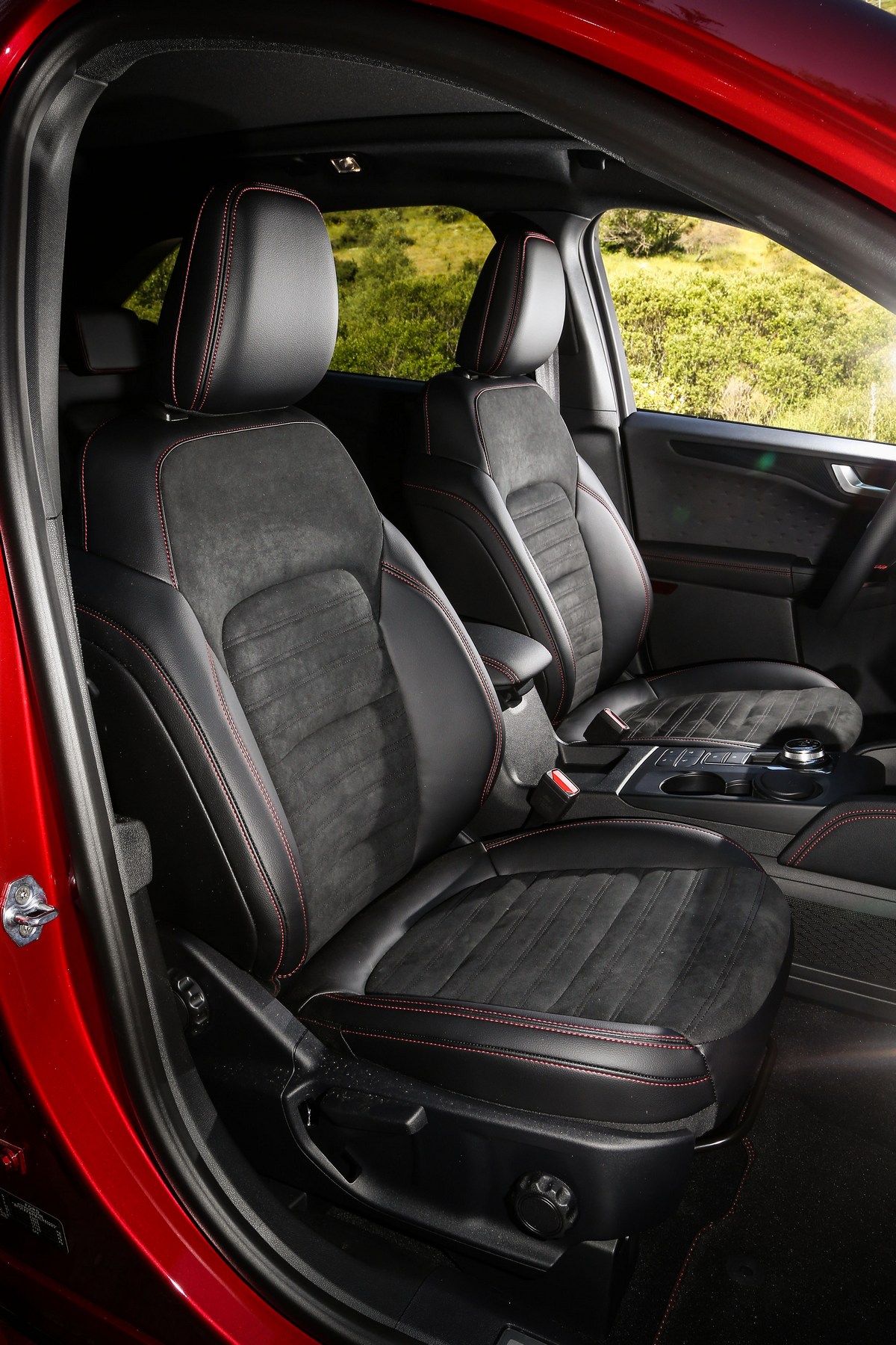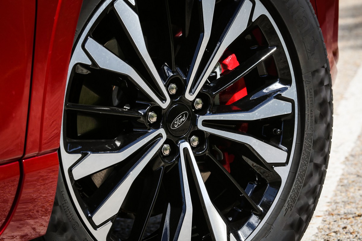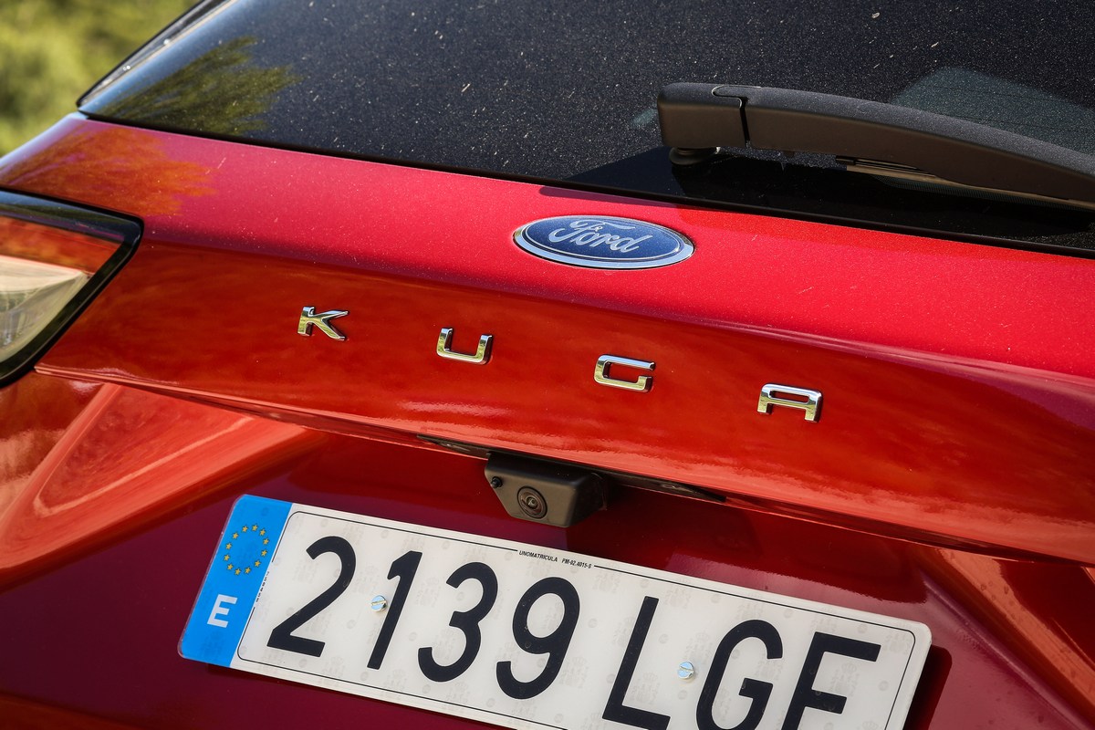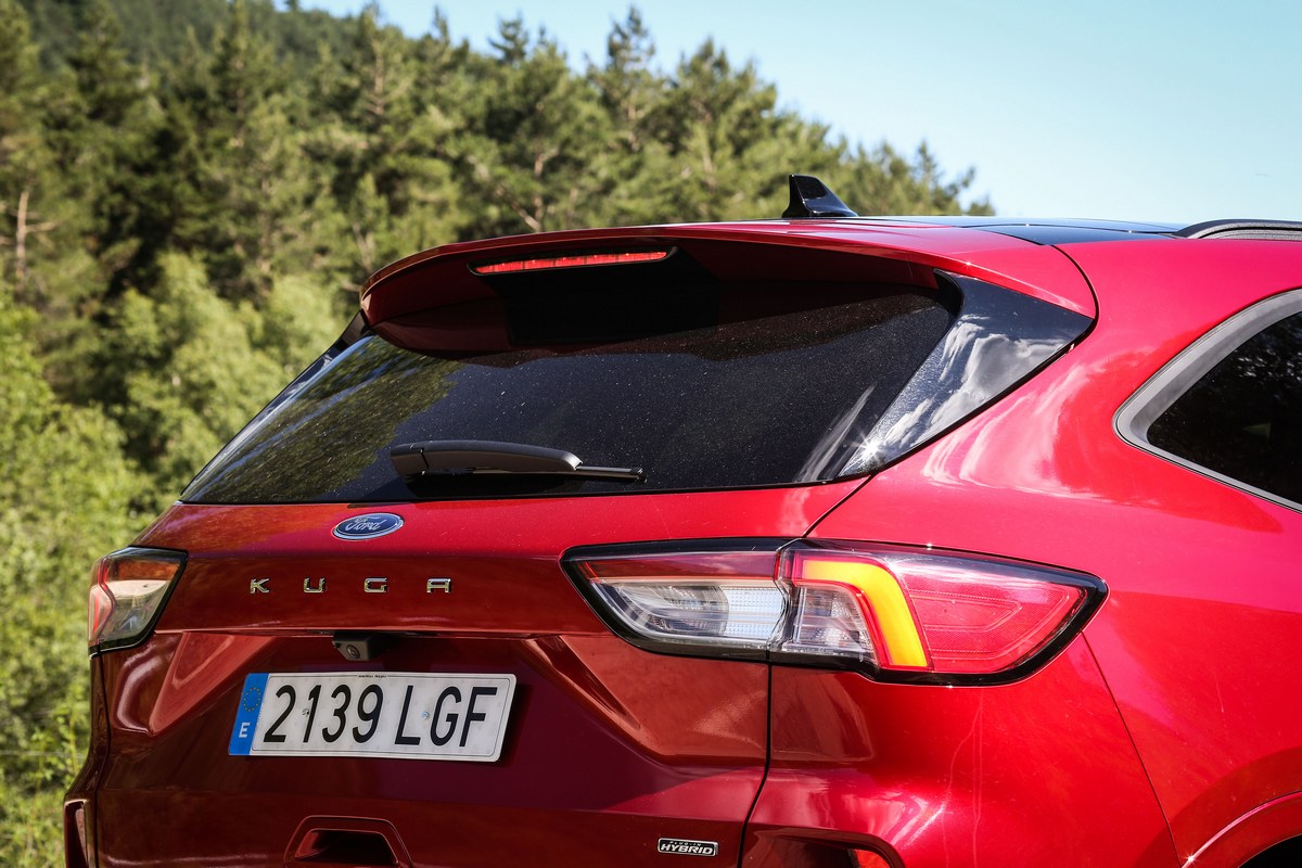 La unidad de las fotos está rematada en un atractivo color ‘Rojo Lucid’ (850 euros) y cuenta con el acabado ST Line X combinado con el paquete ST-Line Exterior (600 euros). Una opción que añade unas llantas de aleación de 19” (las de serie son de 18”), unas pinzas de freno rojas y un pequeño alerón. Dicho de otra forma, el Ford Kuga híbrido enchufable que he probado y que aparece en las imágenes luce la imagen más deportiva posible.