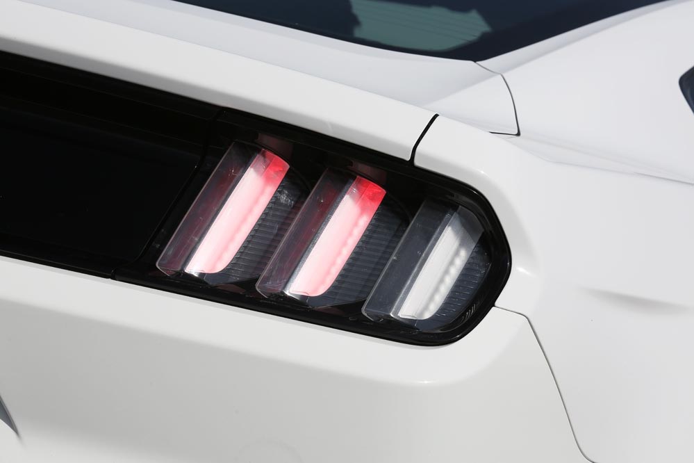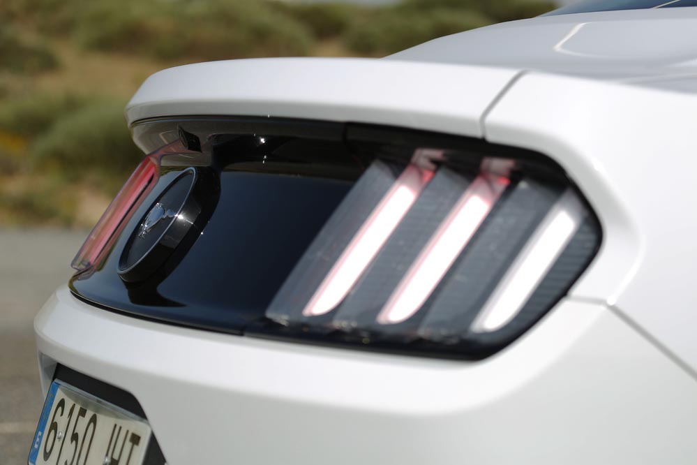 Su frontal porta una mirada fuerte, de gran presencia, y mucha culpa de ello la tienen los afilados pilotos y la disposición de sus luces diurnas LED. Mantiene su enorme capó, que visto desde el asiento del conductor parece infinito. Por su parte, su perfil adopta líneas que le dan empaque a este monstruo de 4,78 metros de largo, mientras que la zaga es tremendamente ancha. Por desgracia, a causa de los requisitos de homologación europeos, la versión que se vende en el Viejo Continente no adopta las luces de accionamiento por secuencia, algo que fue discutido por razones económicas y que finalmente, y acertadamente diría yo, se ha mantenido en las unidades que se venden en suelo americano.