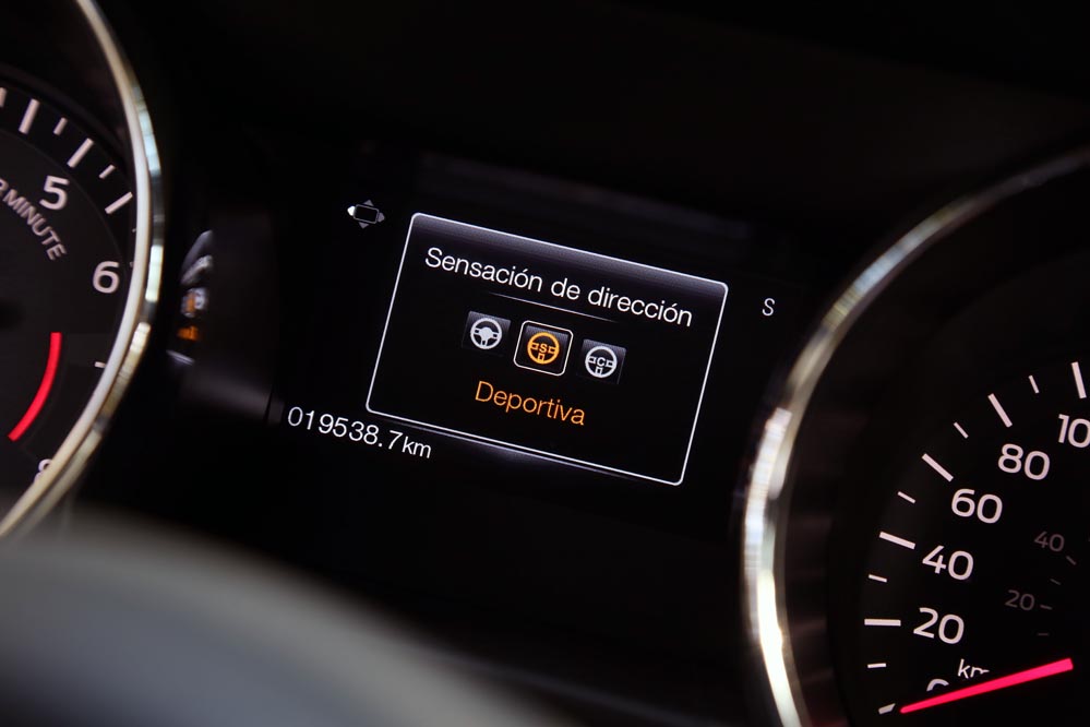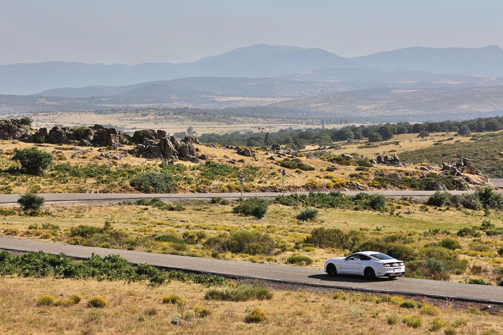 Ford ofrece la oportunidad de adaptar el Mustang al gusto del conductor. Para ello existe la posibilidad de elegir entre cuatro modos de conducción: ‘Normal’, ’Sport+’, con el que se desconecta el control de tracción; ‘Track’, gracias al cual el control anterior y el ESP no entran en funcionamiento; y ‘Lluvia/Nieve’. Además, existe la posibilidad de modificar el tarado de la dirección gracias a los programas ‘Normal’, ‘Sport’, ‘Confort’. El último facilita las maniobras en ciudad gracias a que el volante ofrece poca resistencia. En el más deportivo, se endurece. Con esta variante, mi opinión sobre la dirección, que es eléctrica, mejora, puesto que el tacto no llega a convencerme al no transmitir al 100% lo que ocurre en el asfalto y al resultarme algo flotante. Es directa, bastante directa, pero no llega a la altura de sus rivales alemanes. Lo mismo ocurre con su suspensión. Ha sido adaptada al gusto europeo, sustituyendo el eje rígido trasero por una independiente multibrazo. Por tanto es cómoda y el cuerpo no se resiente en ningún momento. En curva no brinda excesivos balanceos, algo que se agradece en un deportivo de raza como el que tengo entre manos, pero sus oponentes están un paso por encima. También esta por encima, y mucho, el precio de estos, que en la gran mayoría dobla al del ‘pony car’.