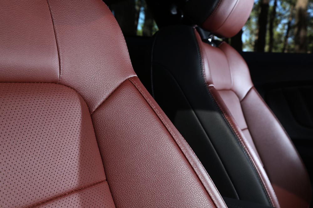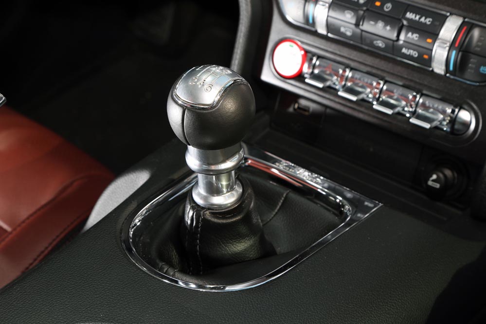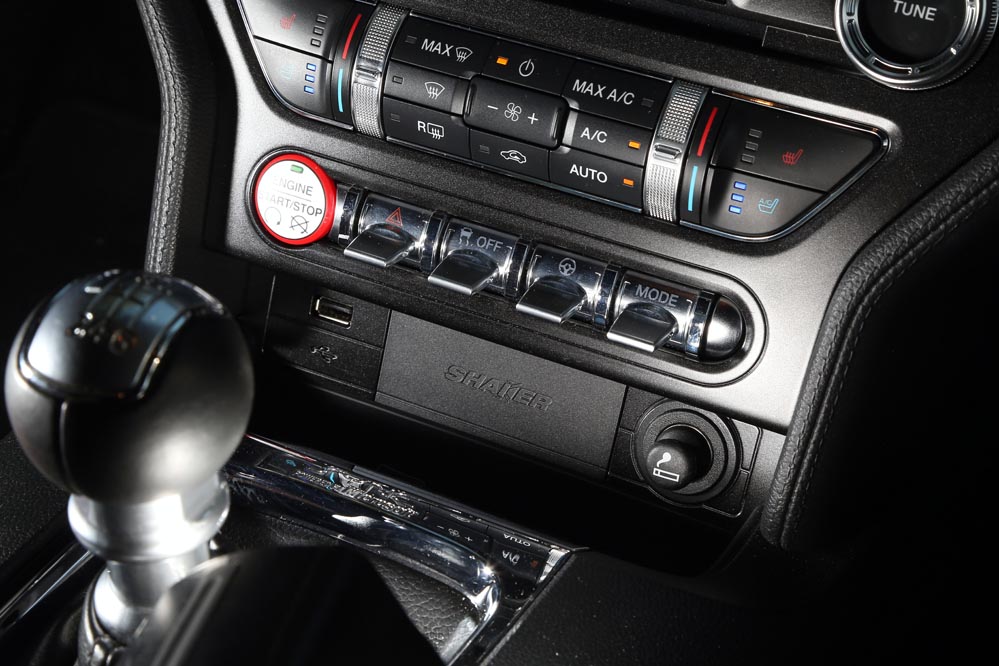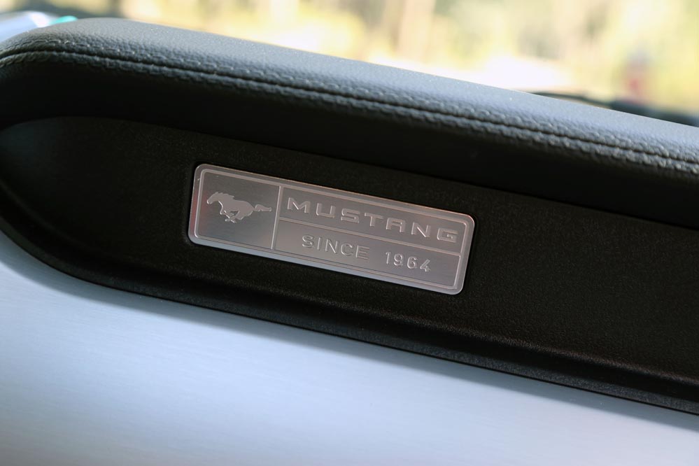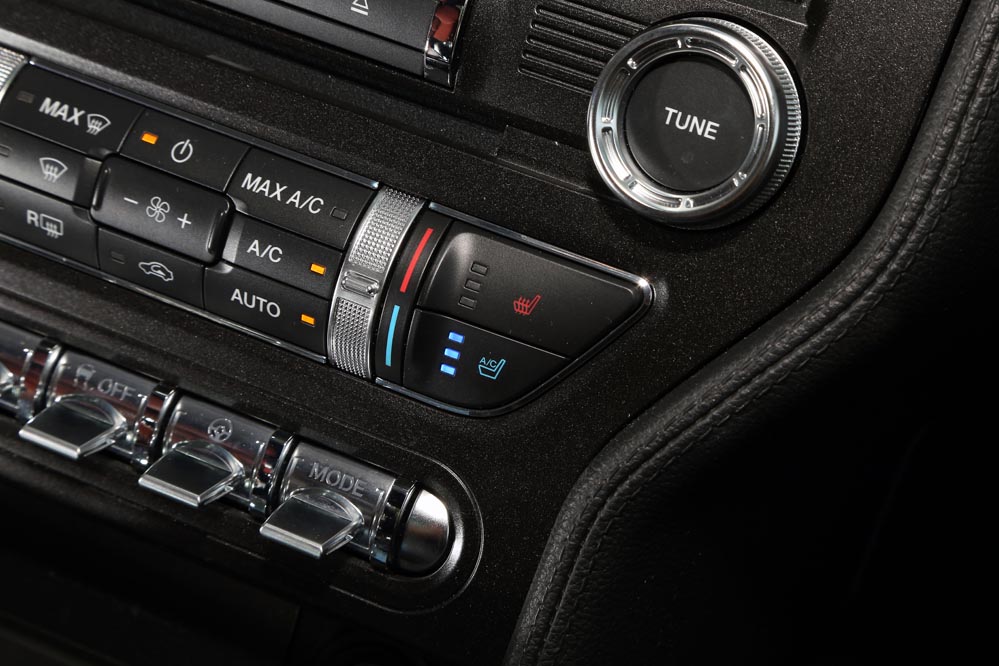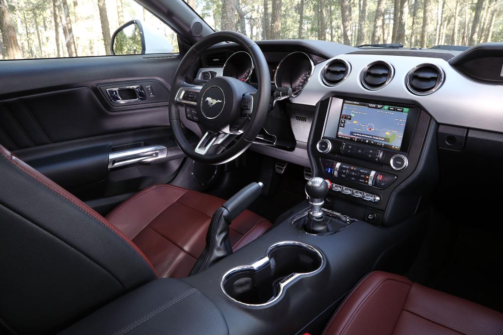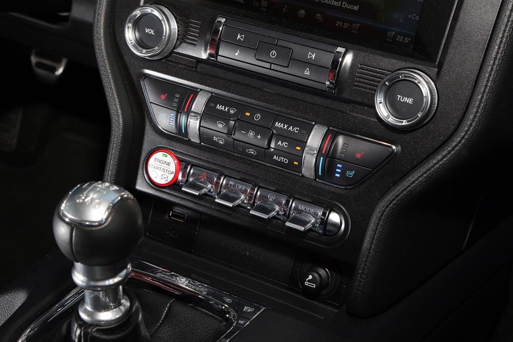 Una vez acomodado en sus confortables asientos, acción que se realiza con facilidad gracias a que no están situados extremadamente bajos, es hora de echar un vistazo al habitáculo. En esta nueva generación, el Mustang ha ganado muy mucho, quizá porque por primera vez en su historia, es comercializado en Europa, y ya se sabe que en esta lado del Atlántico tenemos unos gustos más sibaritas… La apariencia visual es bastante buena. Incorpora cromados que aumentan esa sensación, como los botones de la parte baja de la consola central, de los que esperaba un accionamiento más logrado. También la enorme pantalla táctil de 8” del sistema de infoentretenimiento o la de 4” del cuadro de instrumentos, así como el cuero que recubre el salpicadero. Estos elementos hacen que los plásticos duros de los paneles de las puertas, de la consola del túnel de transmisión y del apoyabrazos lateral de las plazas traseras pasen más desapercibidos.
