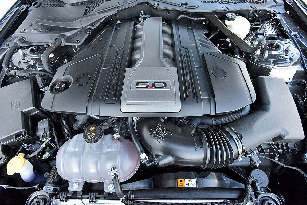 Enciendo el motor, el único disponible: el V8 Coyote, 5.0, atmosférico, con 480 CV (460 en Europa) y un par de 569 Nm (529 Nm). Es el único bloque disponible; ha sido mejorado gracias al sistema de admisión del Shelby Mustang GT350. También la misma barra de torretas, aunque con la chapa Bullitt.