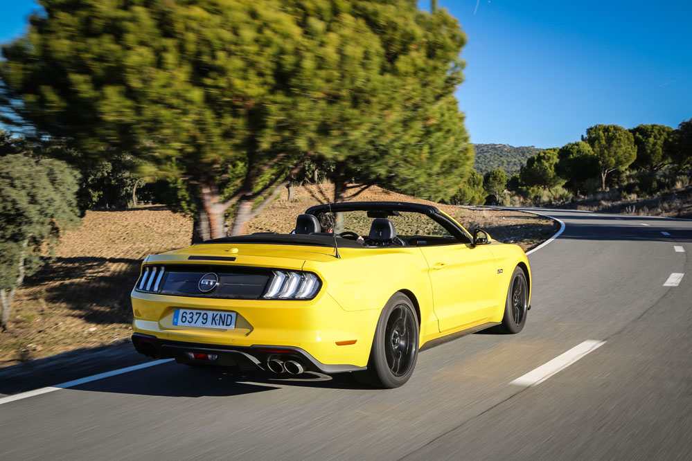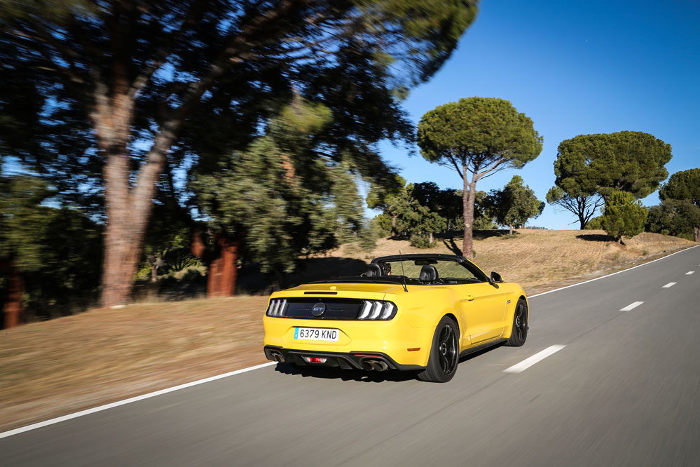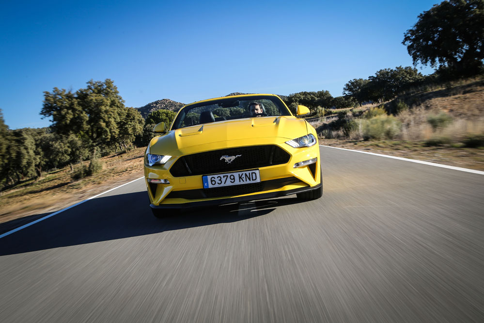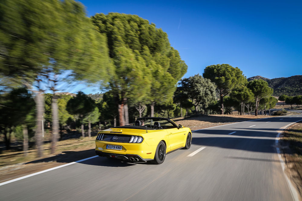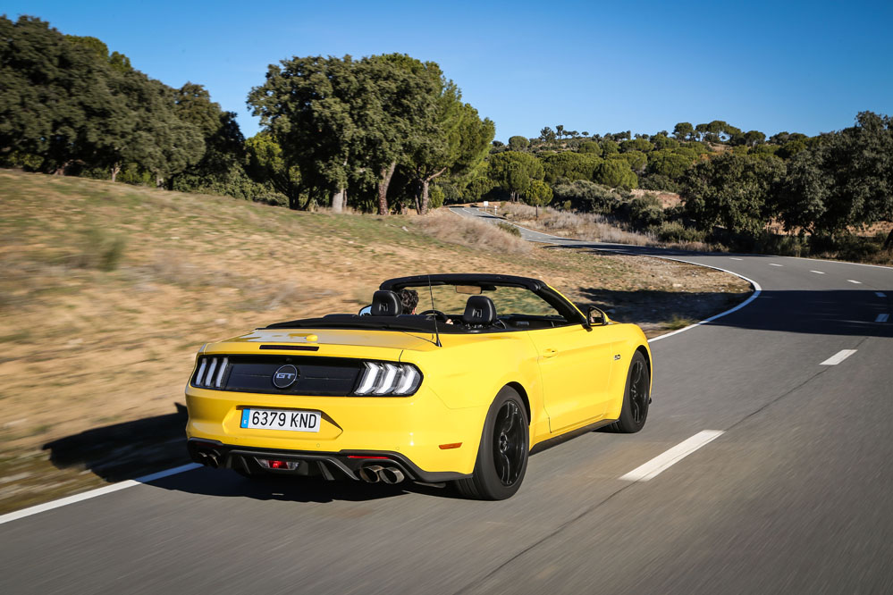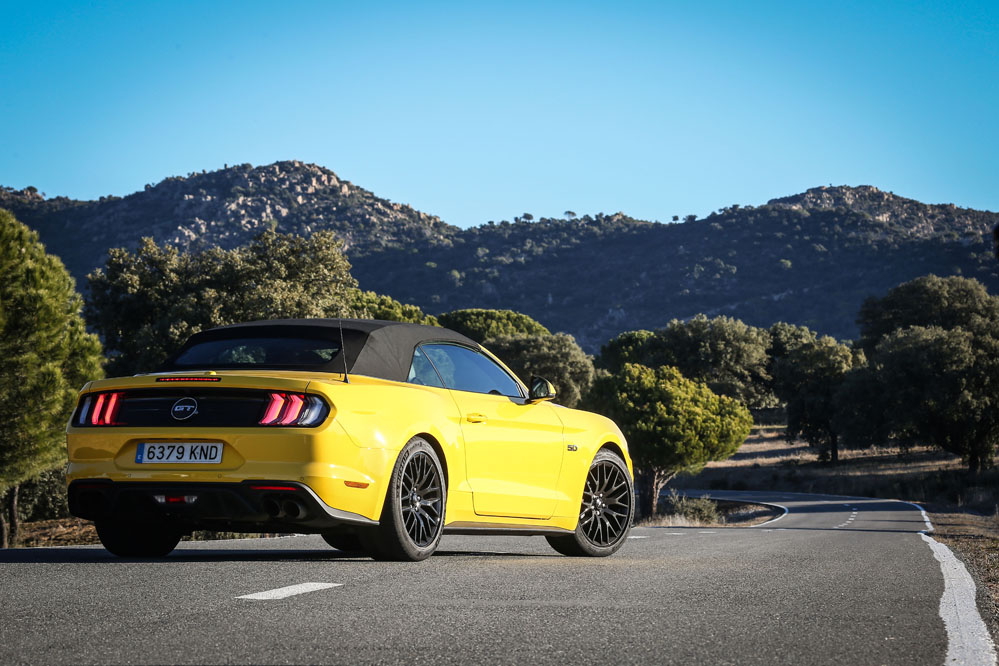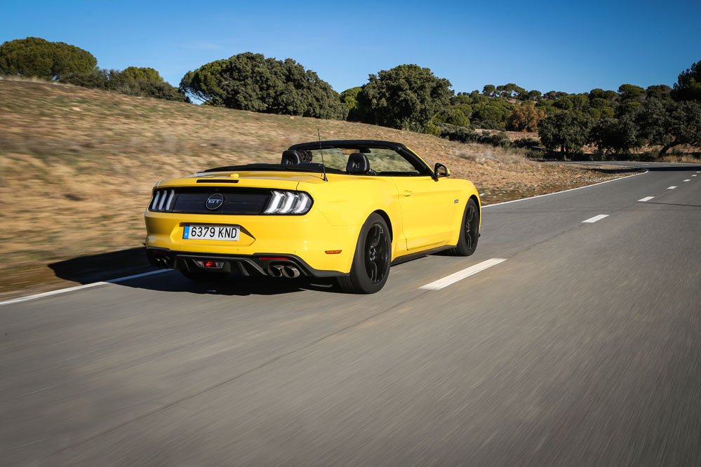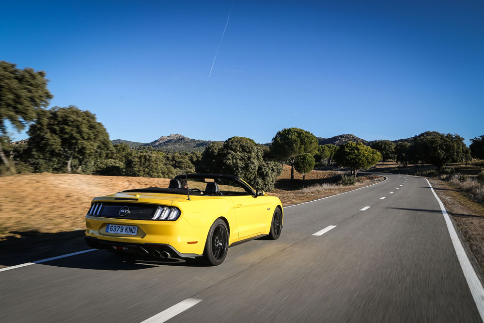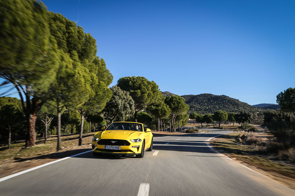 Pues esta vez, un servidor ha tenido el honor de ser el conductor de esa estela amarilla, de probar el Ford Mustang Convertible GT 5.0 Ti-VCT V8. Viene en formato descapotable con cambio automático de 10 velocidades y, lo que es más importante, un carismático motor V8 de 450 CV que pondría los pelos de punta a la mismísima Carmena y su Madrid Central.