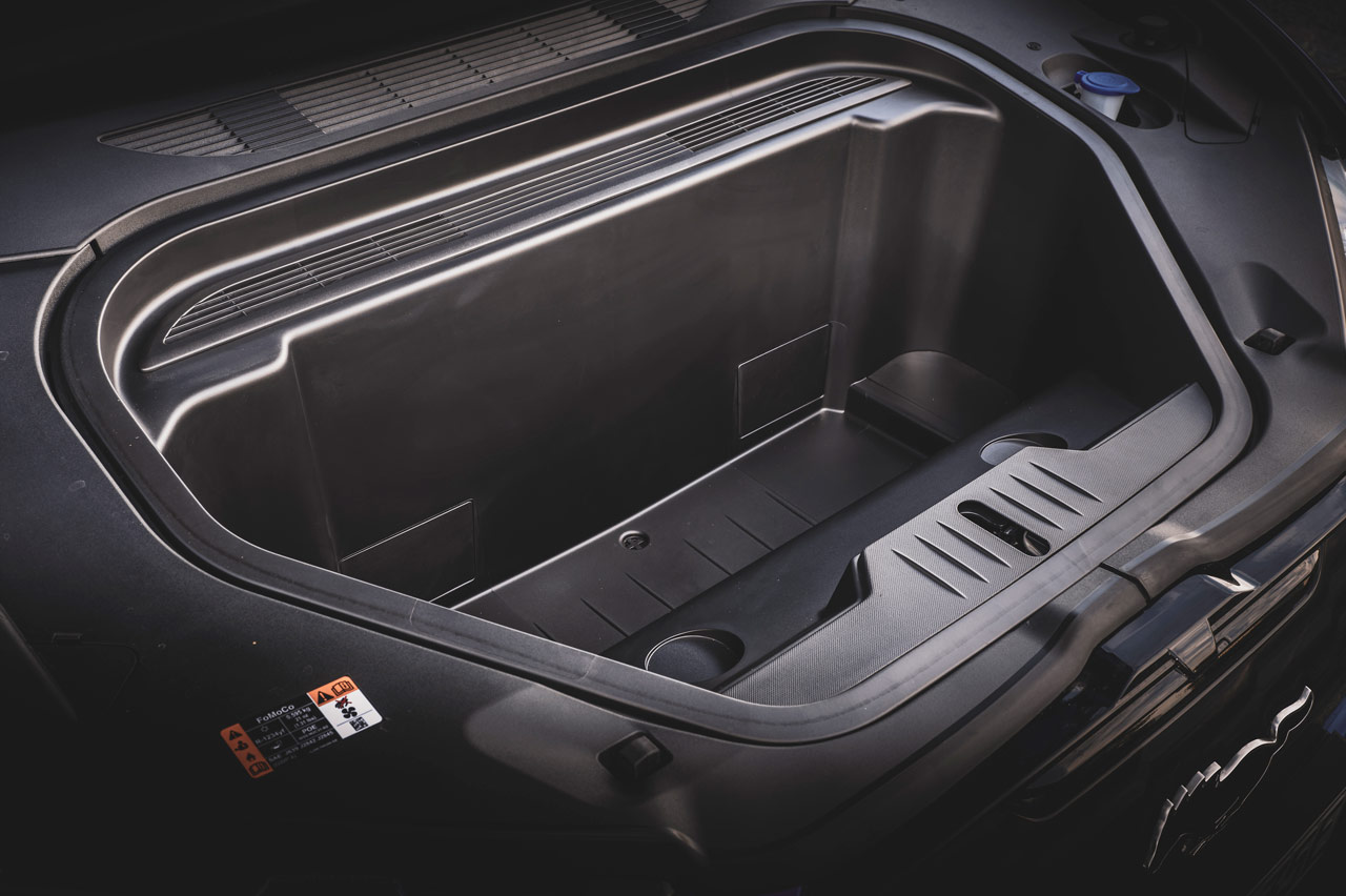 Entre ambos ejes y en el piso del coche se alojan las baterías aseguradas dentro de una caja impermeable rodeada de protección para absorción de choques. Están refrigeradas por líquido para optimizar el rendimiento en condiciones climatológicas extremas y mejorar los tiempos de carga y llama la atención que en este caso por contar con una batería de autonomía extendida y más protuberante en su parte trasera, el maletero y las plazas traseras no sacrifiquen ni un milímetro de espacio según los datos de la marca, por eso el Mustang Mach-E GT ofrece un maletero de 402 litros en la parte trasera más uno de 100 litros bajo el capó delantero, exactamente los mismos datos de sus hermanos de gama.