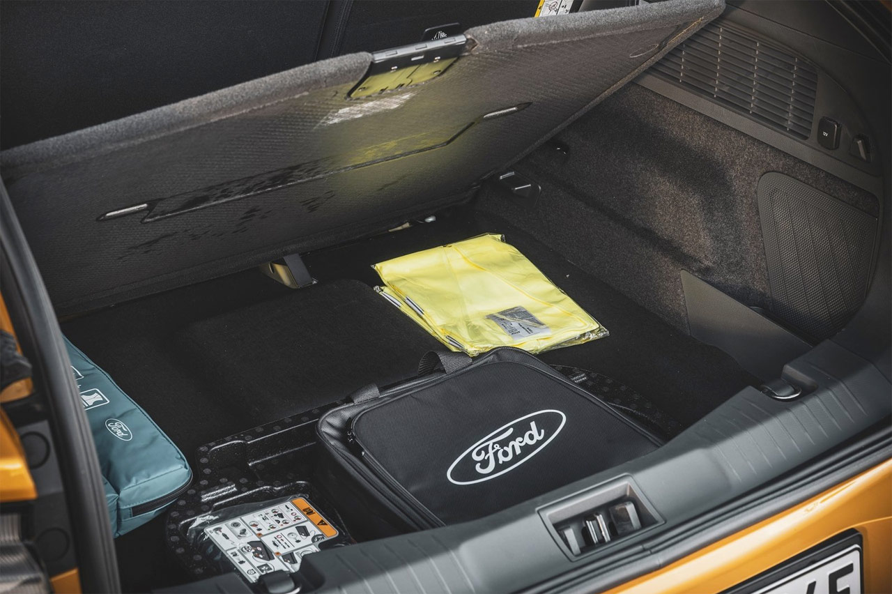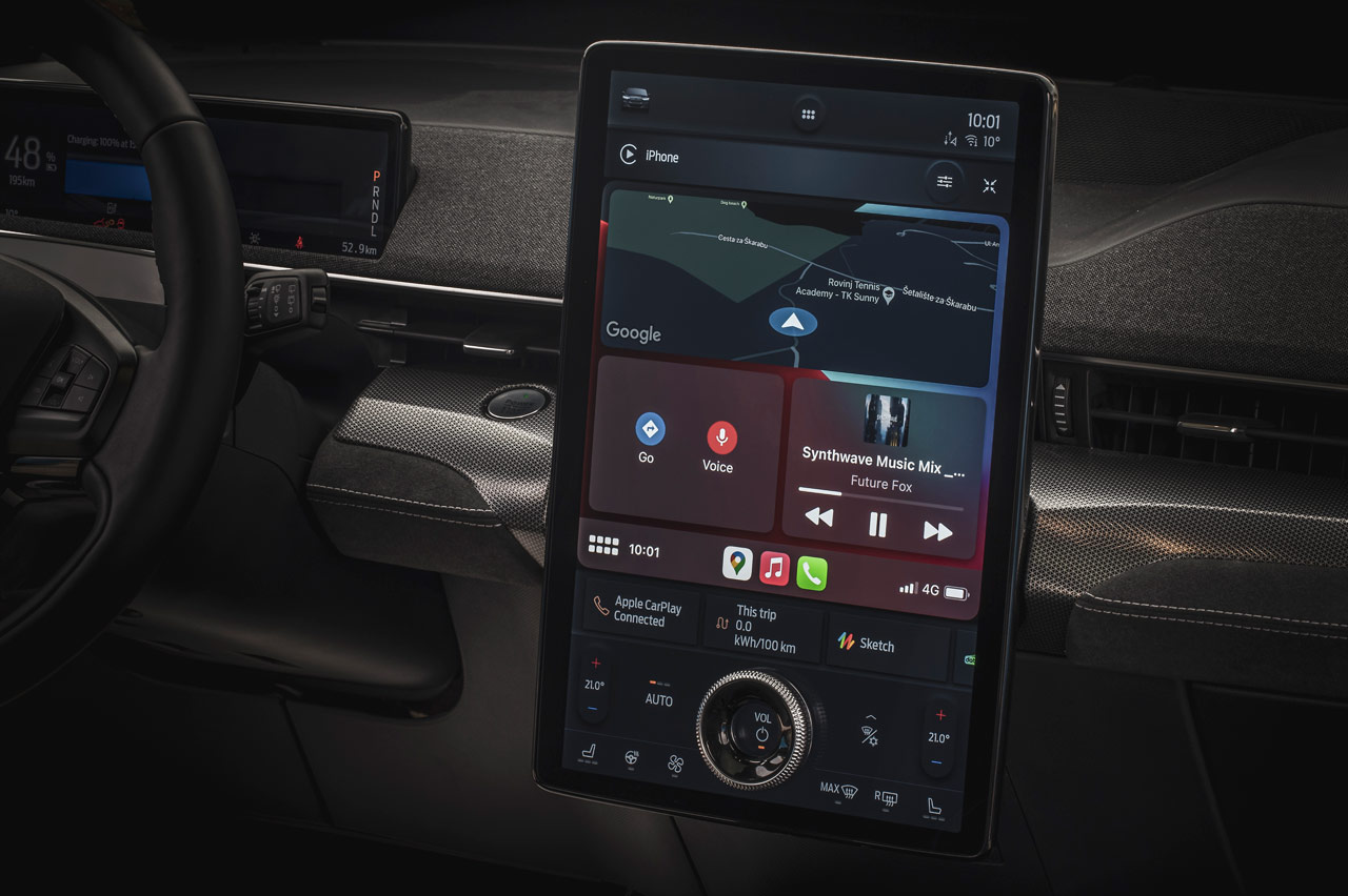 Además de los asientos deportivos Ford Performance, que por cierto sujetan de maravilla en los apoyos más fuertes además de ser muy atractivos, el coche va equipado con frenos Brembo, llantas de aleación de 20 pulgadas de serie, colores exclusivos Azul Grabber y Cyber Orange, y una pantalla táctil Full HD de 15,5 pulgadas (un poco más grande que la de los Tesla) que soporta la nueva generación del sistema de comunicación y entretenimiento SYNC de Ford, que parece ser aprende de los comportamientos del conductor. Y tras unos primeros momentos abrumado por el tamaño y sus posibilidades a pesar de manejar diariamente un iPad grande, lo cierto es que el sistema es muy intuitivo, se maneja sin muchas distracciones y se agradece el tamaño de la pantalla para ver de un simple vistazo cualquier información.