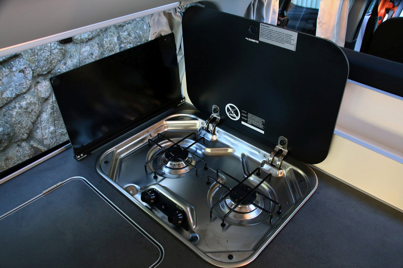 La distribución de la parte trasera incluye el mencionado “salón-comedor”, seguido de un mobiliario en forma de L en el que se sitúan numerosos elementos. Como un fregadero, una cocina de gas con dos quemadores y placas de protección anti-salpicaduras, una nevera (de acceso vertical y 40 litros) y múltiples compartimentos para organizar todas nuestras cosas. En el lado opuesto de la cocina hay mucho más espacio de almacenaje y en todos los casos las puertas y cajones tienen cierres que impiden que se abran durante la marcha.