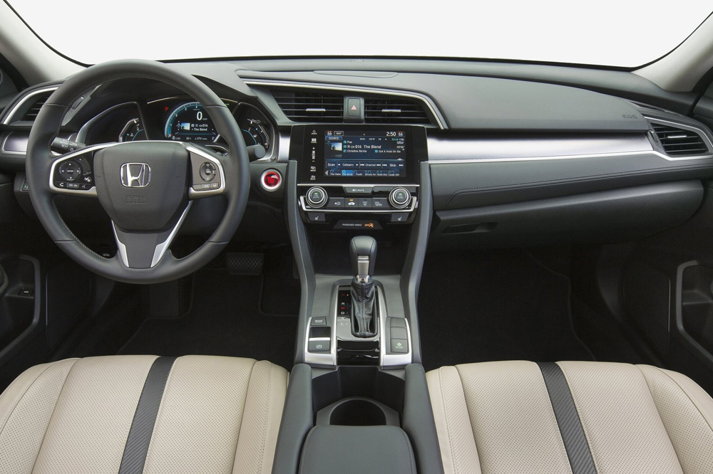 El Honda Civic Sedan 2016 que hemos probado adopta el acabado Touring, por lo que equipa cantidad de extras como asientos tapizados en cuero o el sistema de infoentretenimiento de 7” -por fin, la compañía japonesa se ha olvidado de la doble pantalla que tantas criticas ha tenido-. Estos elementos realzan muy bien el diseño básico de la cabina, donde la ergonomía complementa al diseño. La consola es moderna, pero se aleja de las de ciencia ficción de las últimas generaciones.