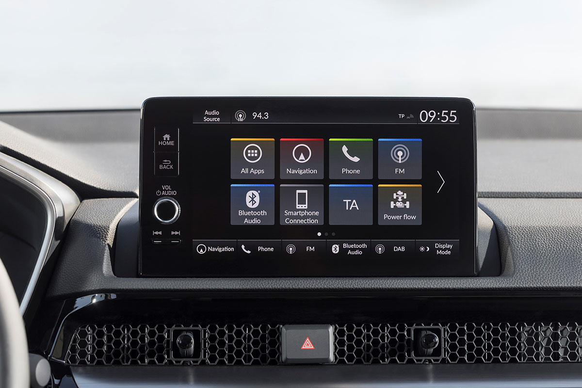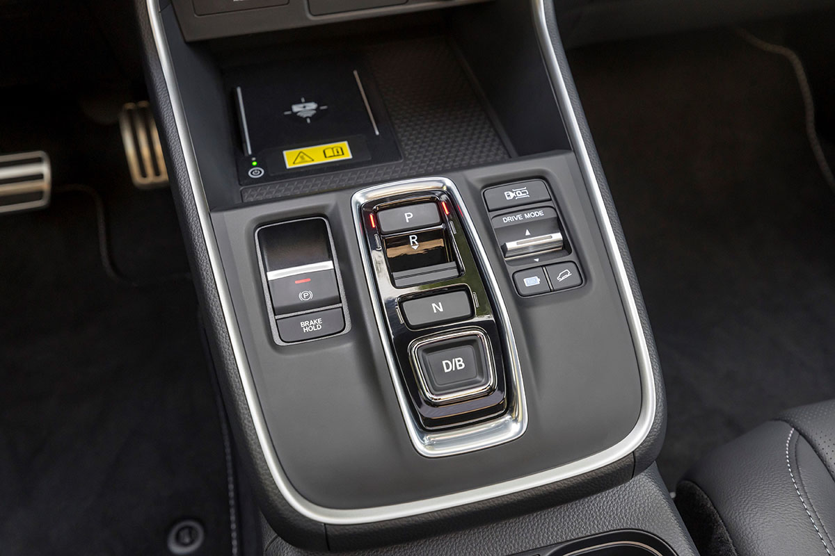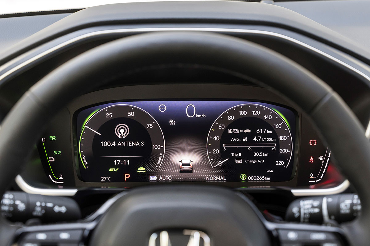 En lo que a modos de conducción tenemos un nuevo comando denominado e:Switch con el que podemos ir variando los programas de conducción. Por defecto circula en el Auto pero si presionamos podemos pasar al EV y de ahí a SAVE (que nos mantiene la capacidad de la batería). Si lo mantenemos pulsados pasamos al CHARGE que carga la batería en marcha. Todo ello combinado con los modos ya conocidos en Honda como son los ECON, Normal, Sport y Snow (nieve) a los que además se suma el TOW en el caso de las versiones e:PHEV, duplicando la capacidad de remolque en comparación con el e:HEV gracias al empuje que proporcionan los dos motores y llegar a los 1.500 kg con freno.