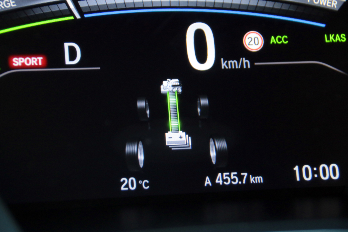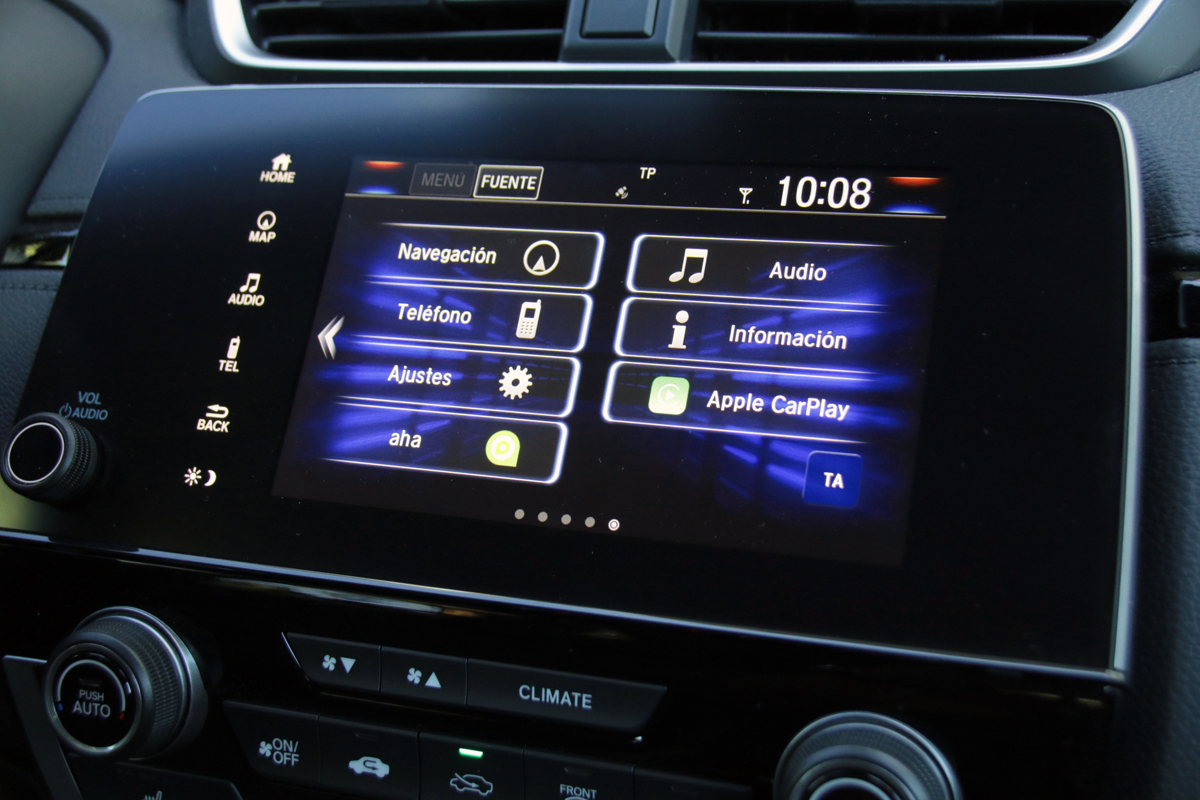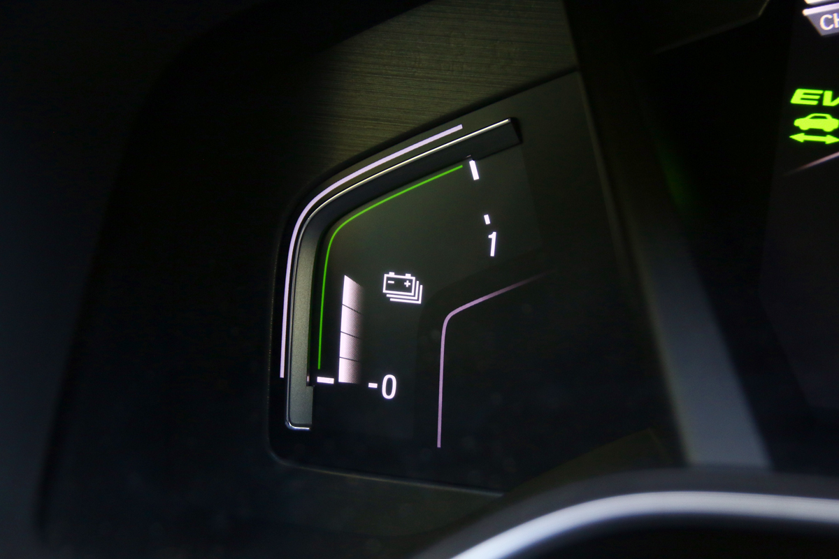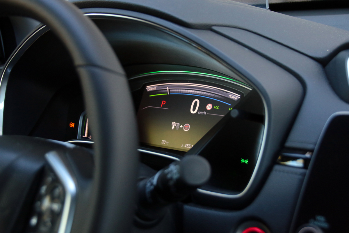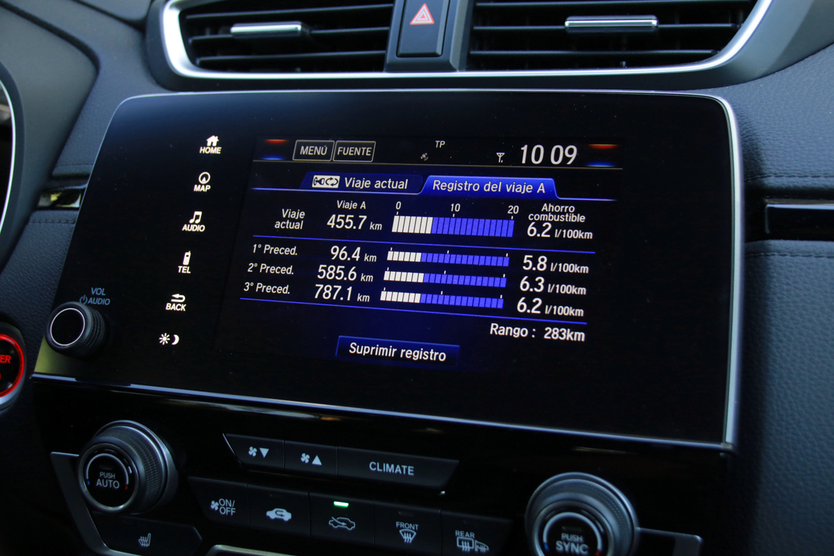 El cuadro de instrumentos también varía ligeramente su forma e incluye a la izquierda del mismo (viéndolo desde el asiento) un indicador de la carga de la batería. También se suman menús específicos del sistema híbrido para mantenernos informados en todo momento de cómo se está impulsando nuestro CR-V Hybrid.