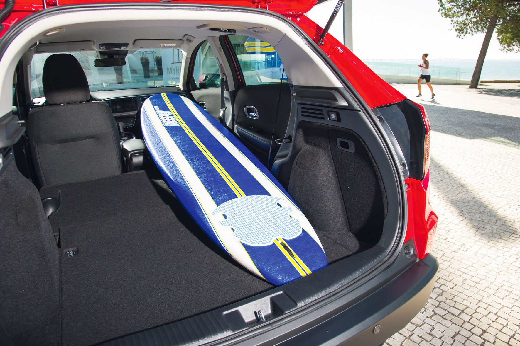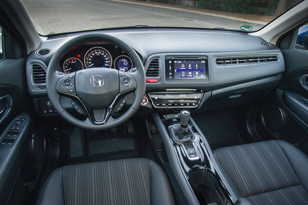 Desde fuera, el SUV parece increíblemente compacto, que contrasta con su desahogado interior. Para poder introducir, por ejemplo, objetos con el largo de una tabla de surf, el Honda HR-V de la prueba hereda los innovadores Magic Seat de otros modelos de la casa. Pero el interior no solo es práctico y espacioso: lo diseñadores de Honda han logrado que también sea deportivo y muy confortable. La elevada altura del coche, así como una consola central que va ubicada también muy arriba, transmite sensación de seguridad al conductor. Por otro lado, los ingenieros de la marca se han empleado a fondo en la insonorización del coche, logrando un nivel de rumorosidad realmente bajo.