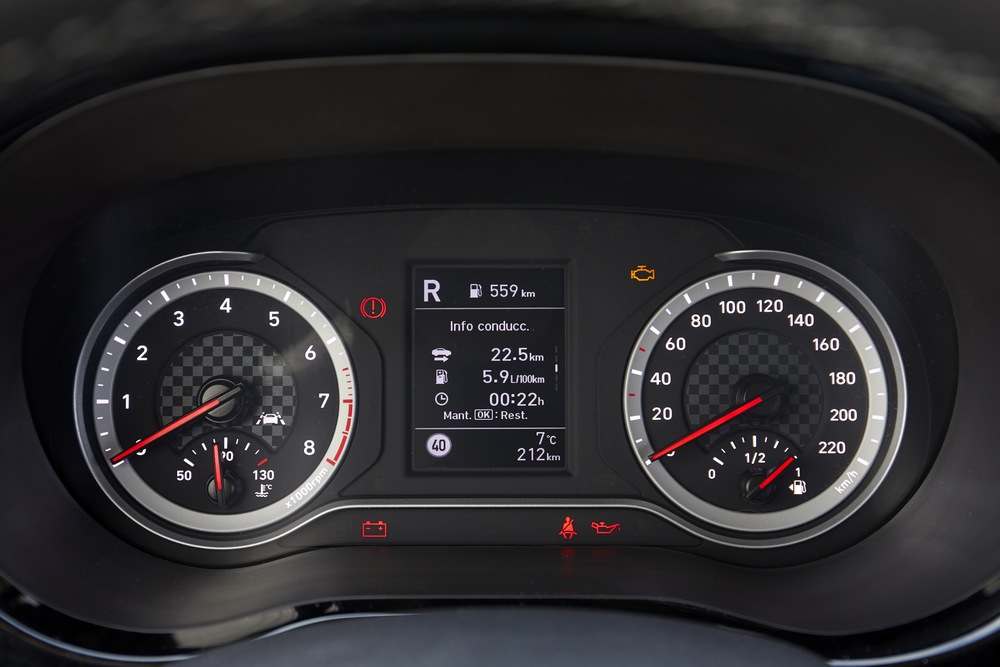 En el salpicadero hay una pantalla de ocho pulgadas, además de la situada entre las esferas analógicas del cuadro de instrumentos. En la primera se aglutinan las funciones del sistema multimedia, es táctil y es compatible tanto con Apple CarPlay como con Android Auto. De manera opcional, puede equipar el sistema telemático Bluelink de Hyundai, que permite entre otras cosas buscar puntos de interés o enviar los resultados de las búsquedas desde el móvil directamente al navegador del coche.