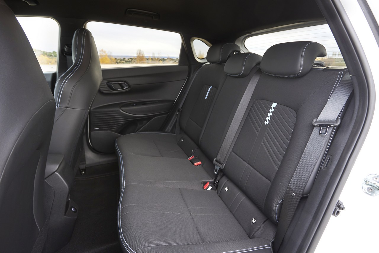 Dentro disponemos de unos buenos asientos delanteros calefactados con el reposacabezas integrado, el volante N en piel y distintos elementos decorativos que lo distinguen. Como el (prueba) Hyundai i30N, el i20N dispone de los botones N en el volante para cambiar configuración de sonido, motor, dirección y ayudas electrónicas.