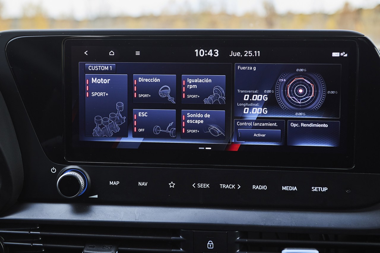 De serie trae el “Rev matching”, que es un dispositivo que realiza el punta-tacón automático. La pantalla es táctil y desde ella se puede configurar los tres modos de conducción, que van de ECO al radical N pasando por el Sport. Desde ahí se puede regular el control de estabilidad en tres etapas, la última totalmente desconectado, y se accede a la toma de datos de la conducción y una función para cronometrar vueltas en circuito y aceleraciones, además de mostrar datos como la potencia, par y acción del turbo.