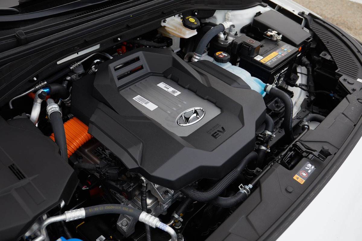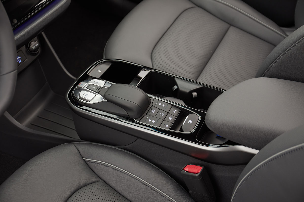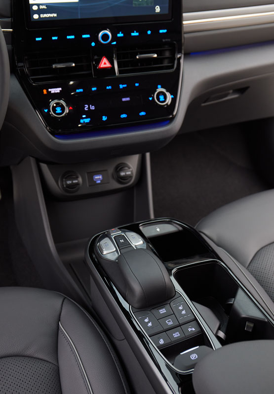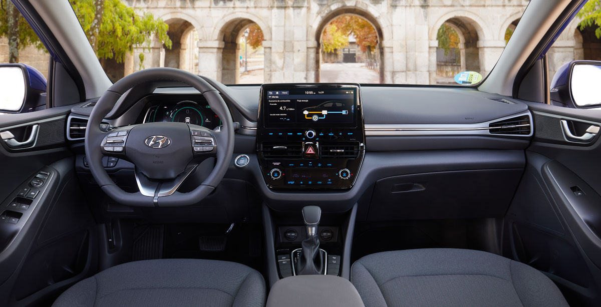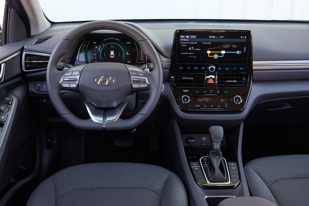Dentro, los cambios también son patentes. Llama la atención al primer vistazo la nueva consola central, realizada en negro piano y que adopta botones táctiles, dandole un toque de modernidad. Se suma una gran pantalla de 10,25 pulgadas que muestra la información del sistema de infoentretenimiento, así como los datos del sistema de propulsión y recarga. El salpicadero acoge una moldura en color antracita, y el cuadro de instrumentos, una pantalla a color de 7 pulgadas. El toque elegante lo da la tapicería de cuero, que ahora también puede ser marrón -como el salpicadero-, y la pincelada novedosa, la luz ambiente azul, recurso que trae por primera vez un Hyundai.