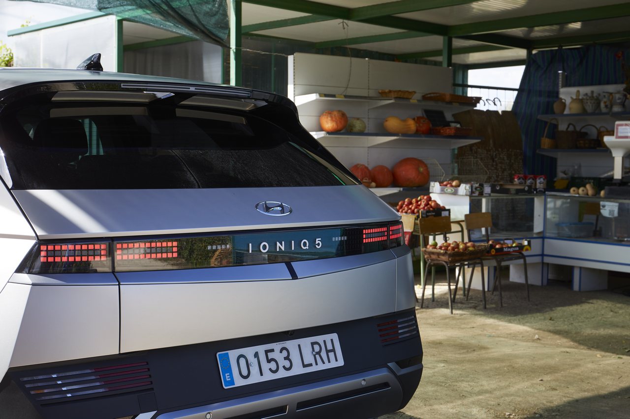 Porque el Ioniq 5 es compatible con la tecnología Vehicle to Load (V2L), que nos permite aprovechar la energía almacenada en la batería principal para otros fines. Así, es posible conectar aparatos eléctricos en el habitáculo empleando dicha toma de corriente; o en el exterior, recurriendo a un adaptador específico que se conecta al enchufe externo y que nos permite disfrutar de hasta 3,5 kW de potencia. Esta última característica y otras que vamos a ver a continuación son consecuencia de la tecnología de la plataforma E-GMP.