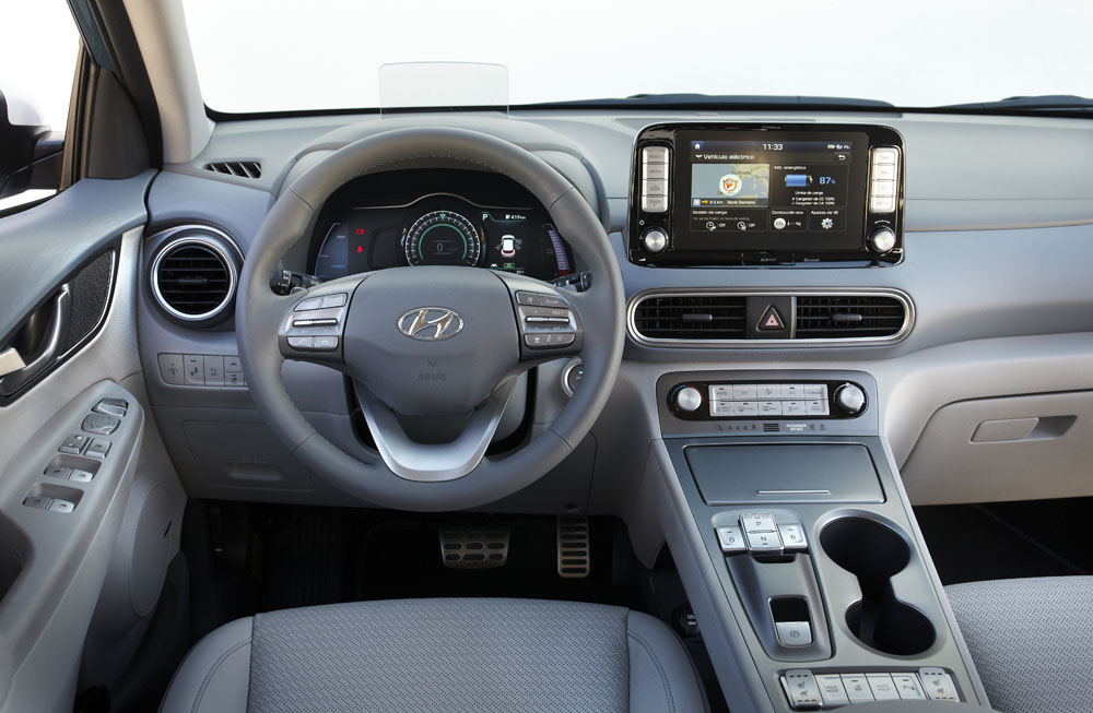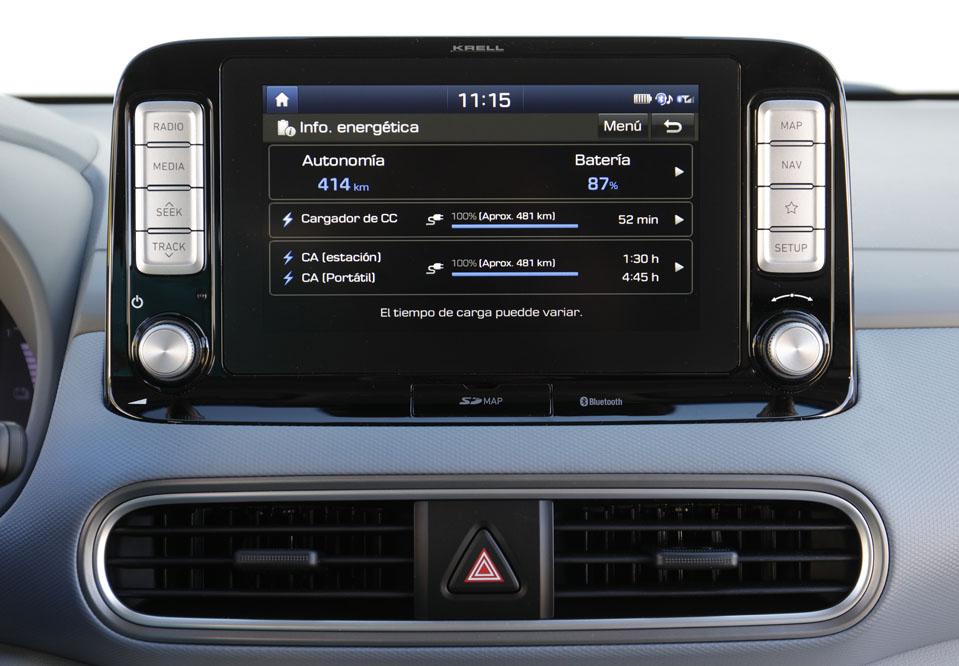 El Kona Eléctrico, que utiliza el conector estándar europeo, puede cargar sus baterías al 80% en unos 54 minutos. Eso en las dos versiones, tanto la de 136 CV y 39’2 kWh como la de la prueba, la de 204 CV y 64 kWh, siempre y cuando utilicemos un cargador de 100 kW. La cosa cambia con uno de 50 kW, donde el tiempo aumenta a 57 minutos en la versión con la batería pequeña y a 75 minutos con la grande. Si el cargador que disponemos es el convencional, con una línea monofásica de 7,4 kW, la carga de la de 39 kWh llega a las 6 horas y 10 minutos, mientras que la de 64, a 9 horas y 35 minutos. Lo bueno del modelo es que nos permite programar tanto el inicio como el final de la carga, aprovechando, por ejemplo, las horas valle. También que me ofrece la posibilidad de configurar la capacidad máxima y mínima de la batería, alargando así su vida útil. Pero eso no es todo, porque puedo programar el tipo de carga en función de la localización en la que me encuentre.