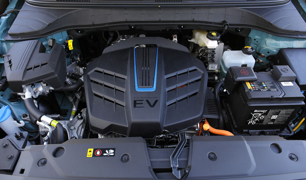 Antes de comenzar con la prueba del Hyundai Kona Eléctrico 64 kWh 204 CV déjame indicarte dónde va alojado todo el tren de potencia: en el vano motor, como si se tratase de un vehículo combustión. Es allí donde podemos encontrar el propulsor eléctrico de imanes permanentes, la electrónica de potencia, todo lo que es el control del motor, el conversor de corriente continua -sirve para cargar la batería de baja tensión-, el cargador de 7,2 kW y el reductor con diferencial, que actúa como caja de cambios.