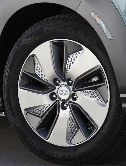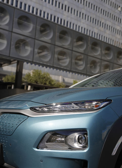 Porque atractivo tampoco le falta. Su nueva parrilla cerrada, que con ella su frontal tiene cierto parecido con Tesla, esconde en su extremo izquierdo el módulo de carga, compuesto por dos tomas de corriente, la luz del estado de la carga, el nivel de ésta y el botón de carga inmediata, que anula la carga diferida o programada. La rejilla está escoltada por los característicos grupos ópticos divididos en dos, ambos full LED. Para mejorar la aerodinámica también se ha modificado la parte inferior de los paragolpes, y ahora tienen forma de ola; la misma que los traseros. Y es que si hablamos de aerodinámica no podemos dejar pasar las llantas de aleación de 17” optimizadas para conseguir la menor resistencia (con neumáticos 215/55R17). Los pilotos también adoptan la misma tecnología, aunque el diseño de las luces es diferente al del resto de la gama. Por todos estos detalles y por la placa ‘Blue Drive’ del lateral, así como por las molduras en gris, podrás diferenciar al Hyundai Kona Eléctrico de los que utilizan diésel o gasolina para funcionar; detalles que siguen manteniendo al Kona como un vehículo actual, sin formas exageras e innecesariamente futuristas.