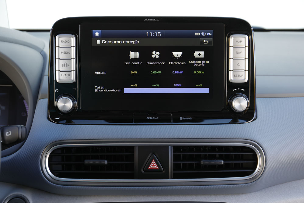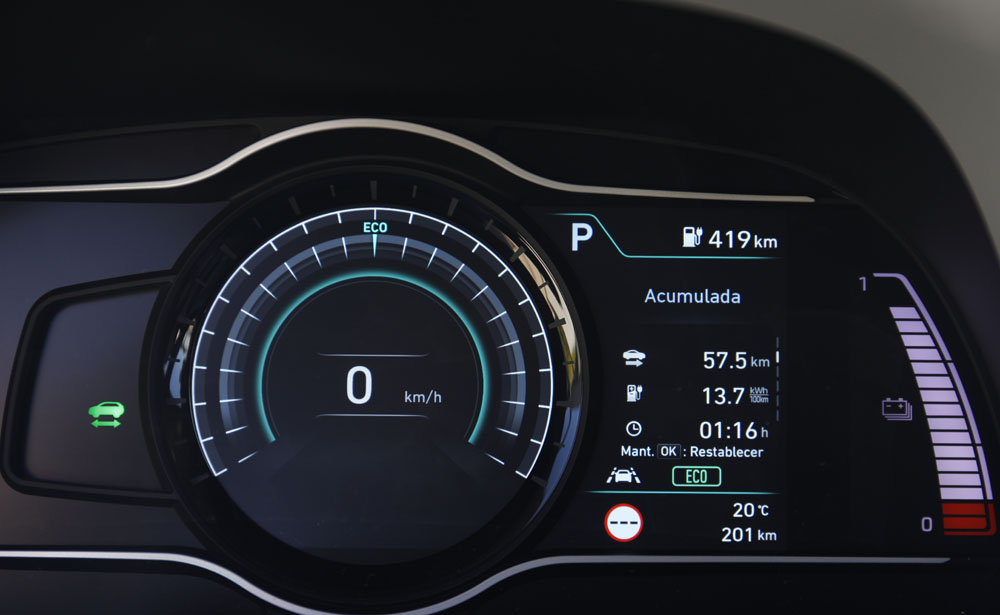 Existen tres niveles de frenada regenerativa, aunque también es posible circular a vela. Lo más efectivo en carretera y alta velocidad es dejar que el coche vaya sin ninguna intensidad de regeneración; recuerda que cuanto menos velocidad pierda, menos velocidad tendrá que recuperar, por lo tanto, menos energía consumirá. Asimismo, fuera de ciudad, tanto el nivel 2 como el 3 pueden llegar a ser incómodos. Lo mismo ocurre en la urbe, donde desaconsejo estos dos niveles siempre y cuando superes los 50 km/h. En cambio, en poblado, debido a los frecuentes cambios de velocidad, sí debes 'tirar' de frenada regenerativa. Y es que el coche me permite subir y bajar de nivel cuando quiera, incluso cuando estoy pisando el acelerador; solo no me lo autoriza cuando estoy pisando el freno. También existe la frenada regenerativa inteligente, que adapta el decrecimiento de velocidad a las condiciones de conducción: si voy circulando detrás de un coche y el Kona EV se aproxima a él, el sistema frena por sí solo, aplicando una frenada regenerativa más acusada.