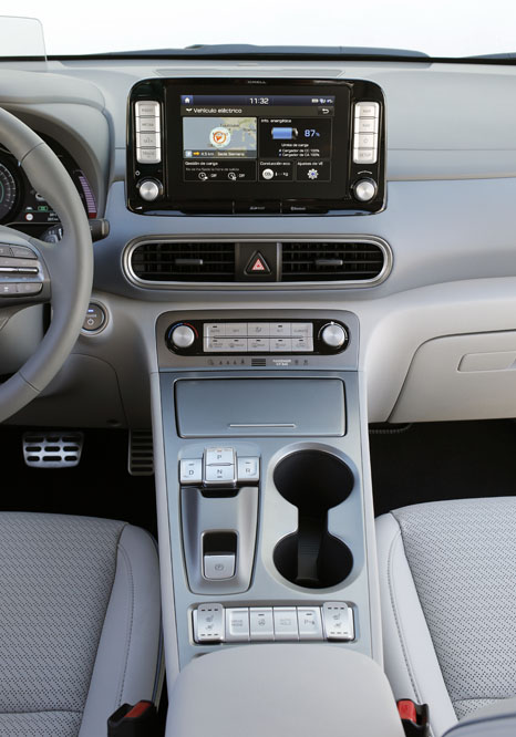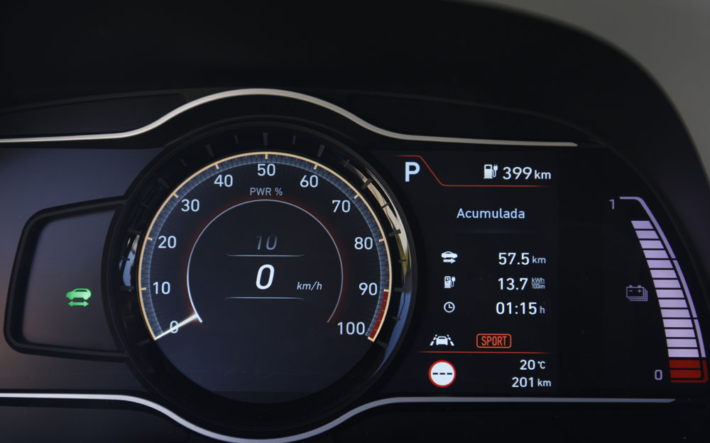 Ahora sí, es hora de darle el botón de encendido. Nada, silencio es lo que escucho, que con la semana de estrés que llevo es algo que agradezco. En la consola tengo el botón que me permite elegir uno de los tres modos de conducción: Eco, Normal y Sport -las prestaciones y la autonomía se ven alteradas-. A éstos se une el modo Eco+, que entra en funcionamiento cuando la autonomía es baja, maximizándola al prescindir de algunos recursos menos necesarios como la climatización. Por cierto, al desenchufarla he visto cómo la autonomía crecía 12 km. Según nos ha informado Hyundai, en ciclo urbano podría superar los 600 km.