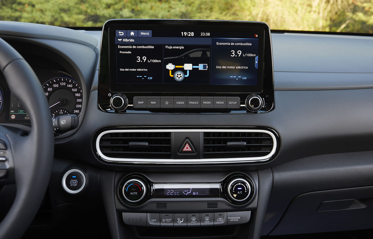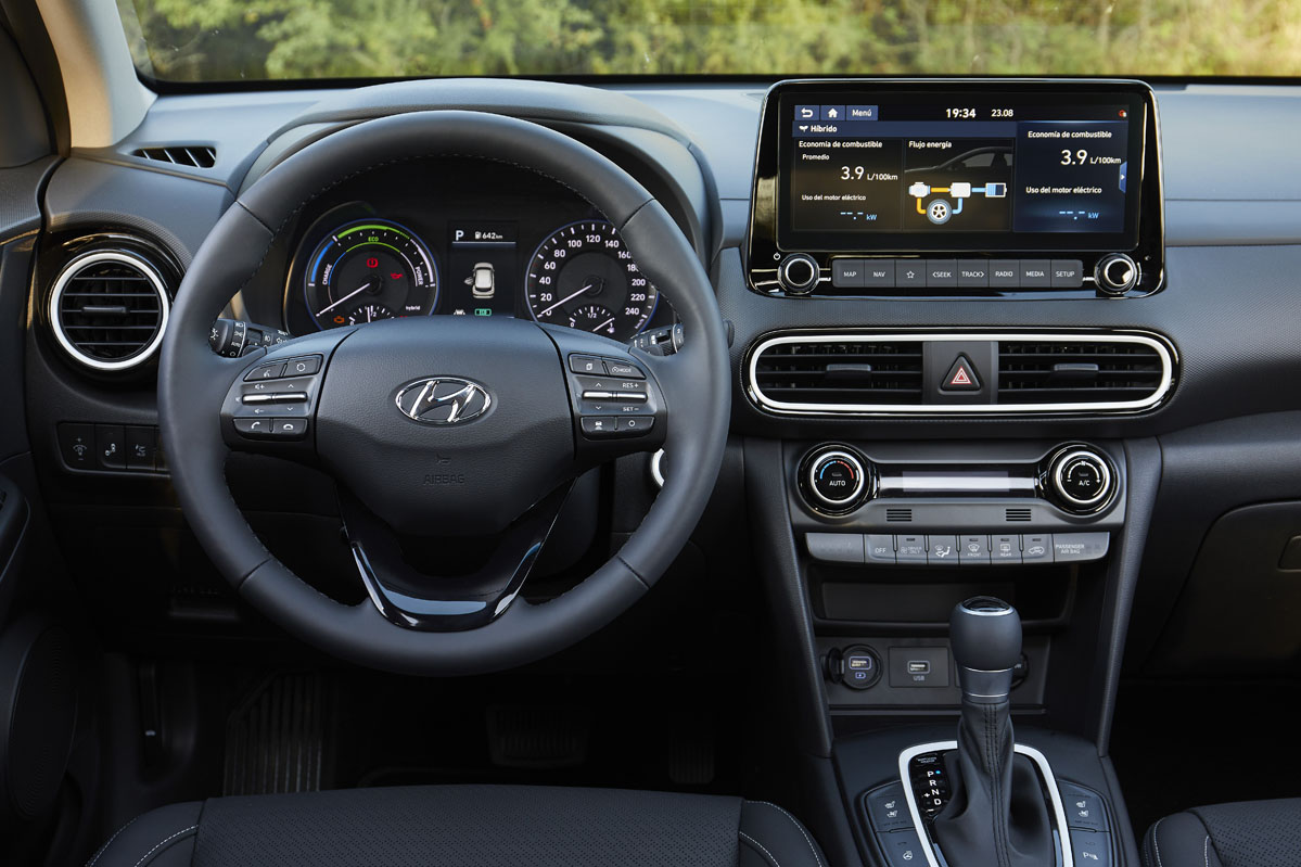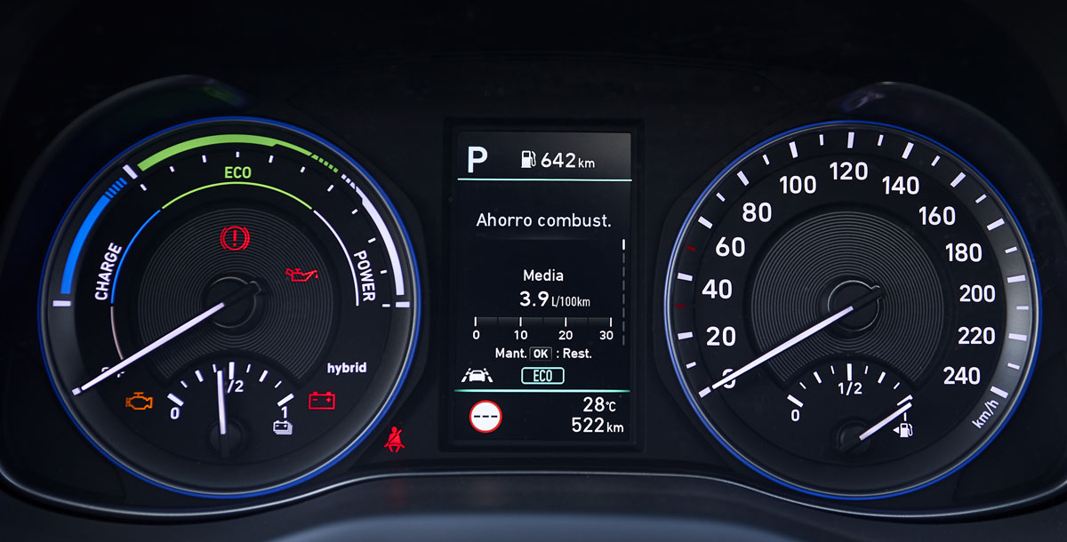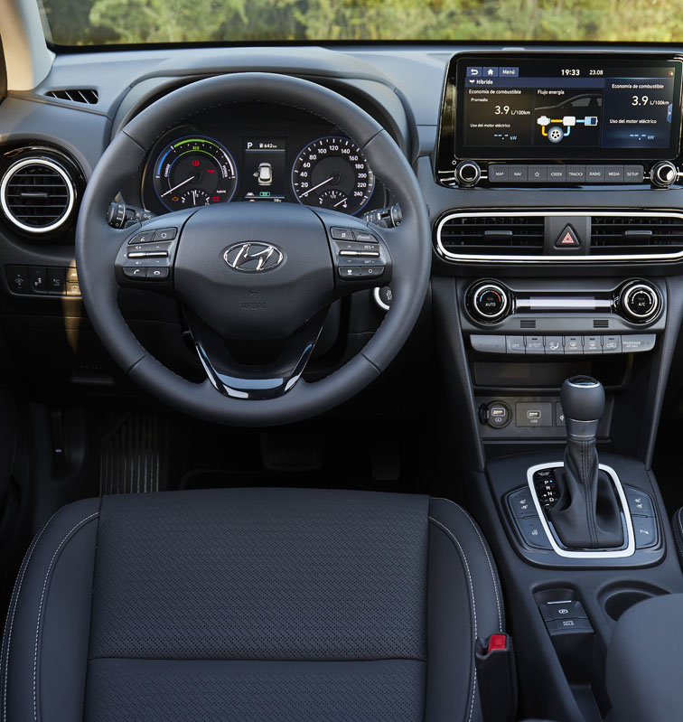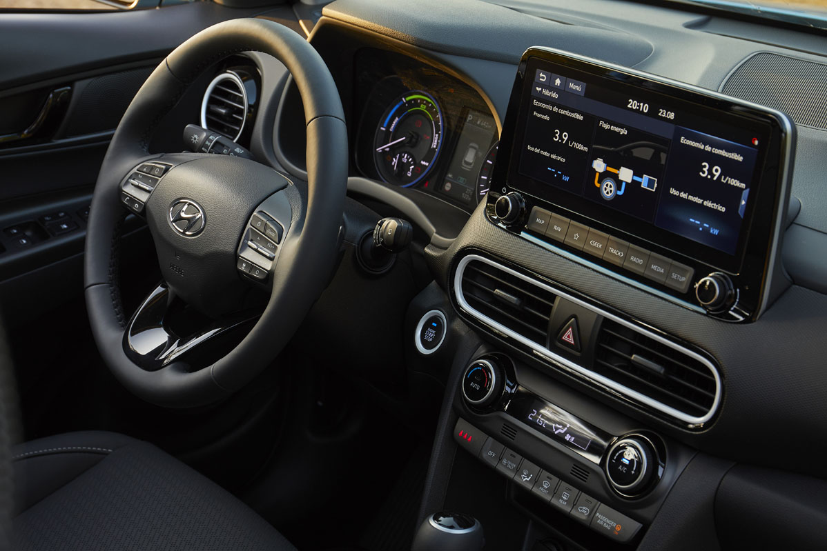 Dentro ocurre los mismo, aunque existen dos cambios que ponen de manifiesto que el coche de esta prueba es el Hyundai Kona Híbrido. El primero de ellos es el cuadro de instrumentos, que ahora en lugar de cuentarrevoluciones, la esfera muestra el uso y carga de la batería. El segundo, es la pantalla del sistema de infoentretenimiento, puesto que es de 10,25 pulgadas -de serie es de 7-, adopta nuevos gráficos y expone nueva información gracias al sistema BlueLink, con el que se puede conocer el tráfico, la meteorología, los radares... Todo en tiempo real.
