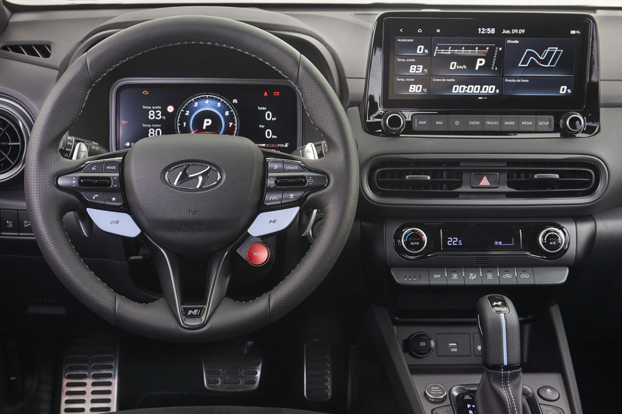 Pero lo que más llama la atención no es la pantalla del sistema multimedia con múltiples gadgets e información deportiva como la temperatura del aceite y del líquido refrigerante, la entrega de par o la sobrepresión, entre otros, sino el volante; es una pasada. No está achatado por la parte inferior, es grueso, está tapizado en cuero perforado con pespuntes en azul y trae diferentes botones prácticos, que no están ahí puestos solo por lucir más y mejor, sino que gracias a ellos se pueden elegir los diferentes modos de conducción o activar la función NGS (N Grin Shift).