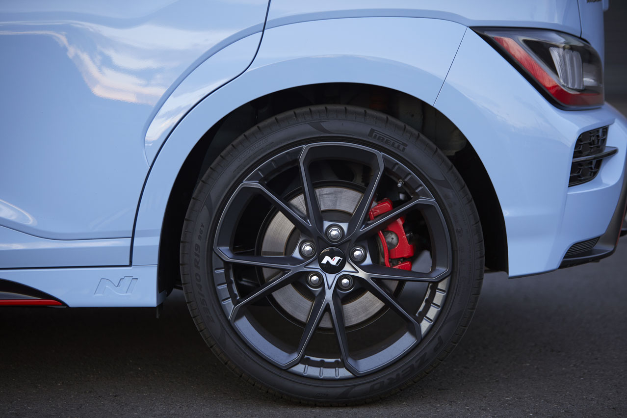 Detrás de esas llantas que montan neumáticos Pirelli P-Zero en medidas 235/40 -hechos para Hyundai, como pone de manifiesto el marcaje HN- se esconden unos frenos ventilados de 360 mm en el eje delantero y de 314 en el trasero, mismas medidas que el hatchback, aunque el todocamino pesa casi 100 kilogramos más. El pedal tiene un pequeño recorrido en el que no ejecutan la acción, pero tras él, finalmente cumplen sin tacha su cometido.