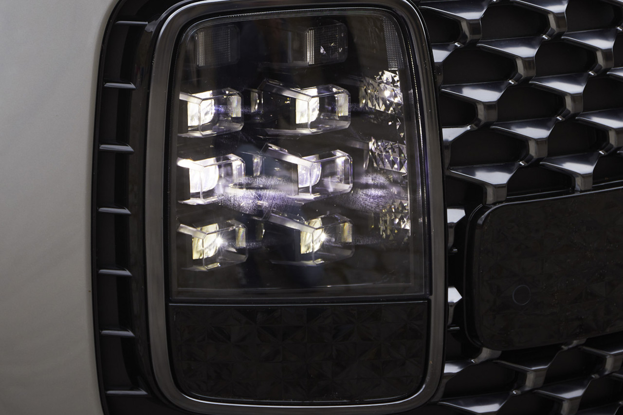 El frontal es sin duda la parte más llamativa gracias, entre otras cosas, a una parrilla ubicada muy cerca del suelo y que ocupa el ancho completo del vehículo. Es tan grande que incluso integra en sus extremos exteriores los grupos ópticos principales. Sobre esta se sitúa una tira luminosa que hace las veces de luz diurna y que completa un frontal con un innegable aire futurista.