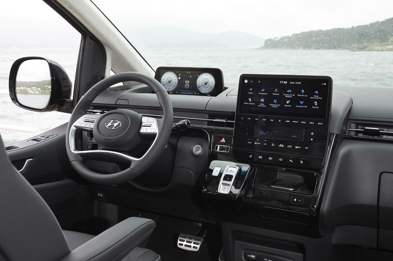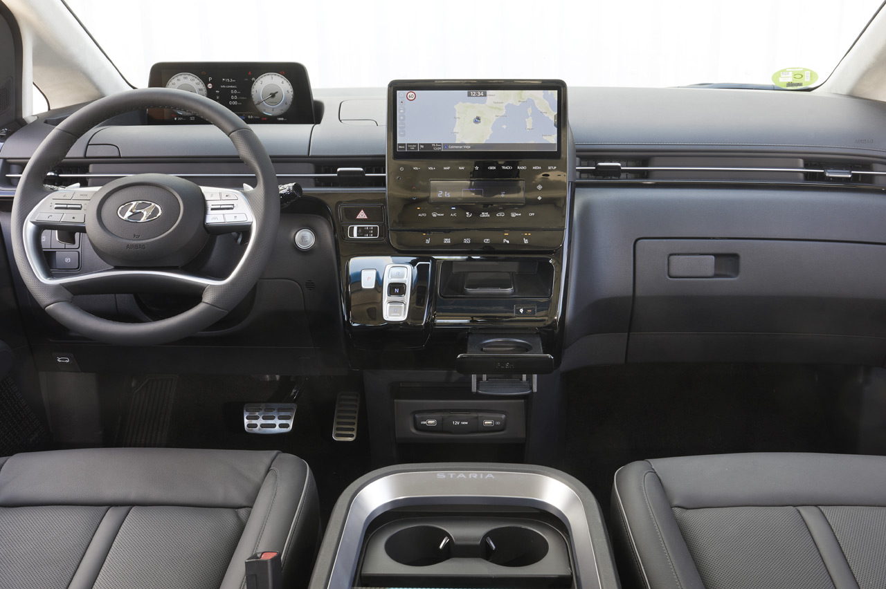 Como buena novedad que es, el Hyundai Staria Style de la prueba viene cargado hasta arriba de tecnología. El cuadro de mandos está formado por una pantalla de 10,25 pulgadas, que queda ‘flotando’ sobre el salpicadero. El sistema multimedia tiene otra pantalla, esta vez táctil, de idéntico tamaño y con un sistema operativo idéntico al de los últimos lanzamientos de la compañía surcoreana. Tampoco le faltan elementos como el cargador inalámbrico para teléfonos móviles compatibles o numerosos puertos USB repartidos por todo el habitáculo.
