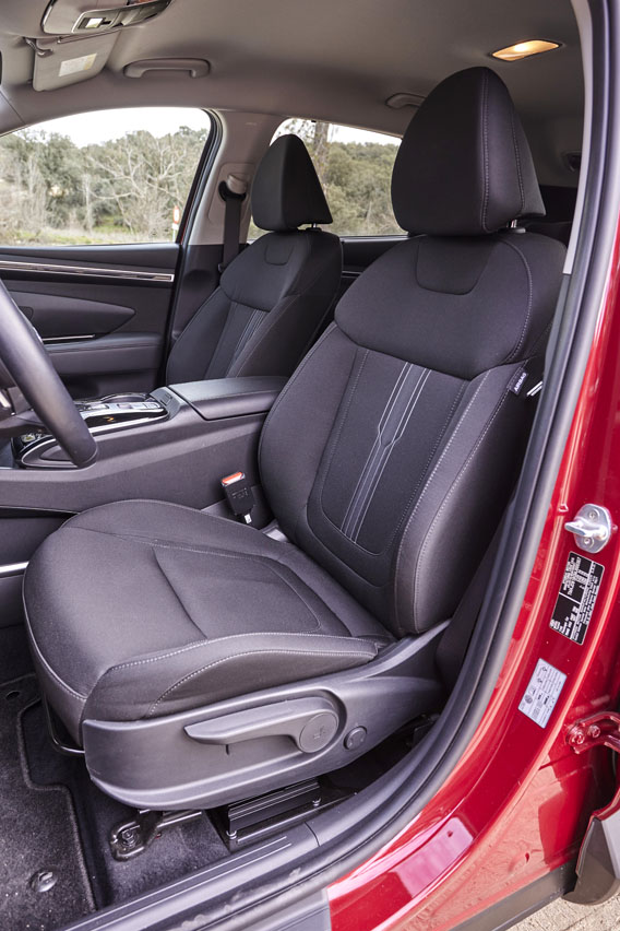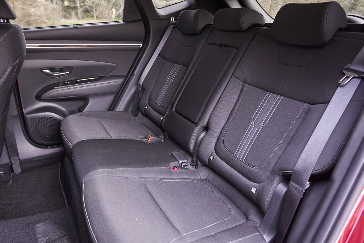 asiento del Hyundai Tucson 1.6 T-GDI 150 CV 48V TecnoContinúo la prueba del Hyundai Tucson 1.6 TGDI 150 CV 48V Tecno desplazándome a la segunda fila. Perplejo me quedo al comprobar que son más de ocho dedos los que separan mi cabeza de rozar con el techo. Hace mucho que con mi 1,78 m de altura no gozaba de este espacio en un coche... El de las rodillas también es muy amplio. Y el túnel de transmisión permite asentarte en la plaza central con más comodidad que en otros coches, eso sí, si el mullido de esta y del respaldo no te parece durito, que lo es...