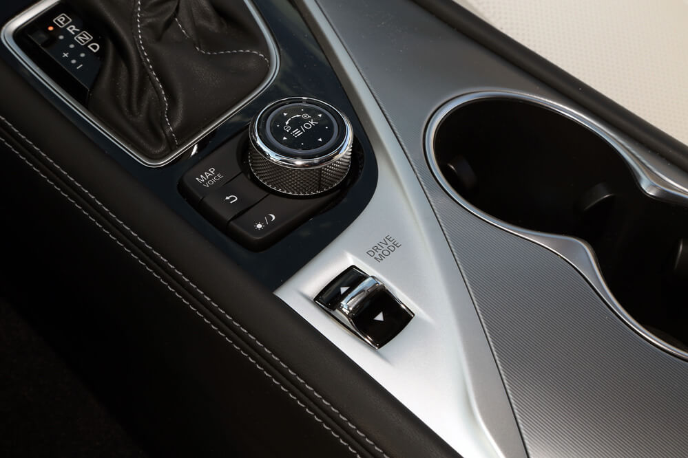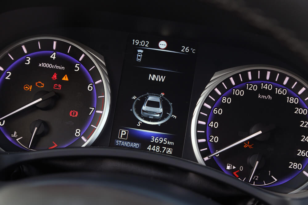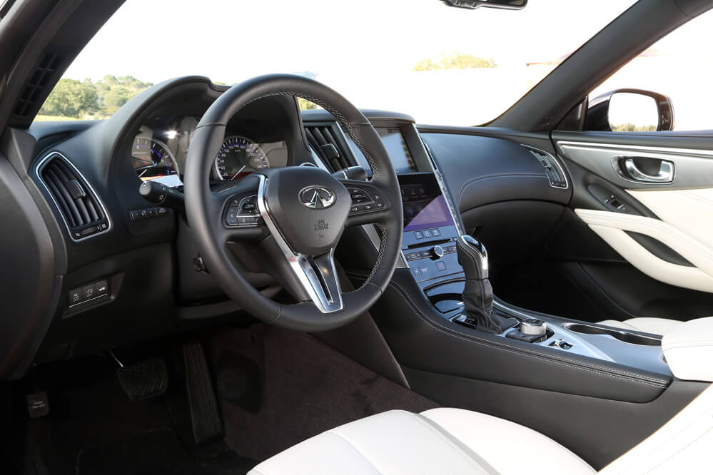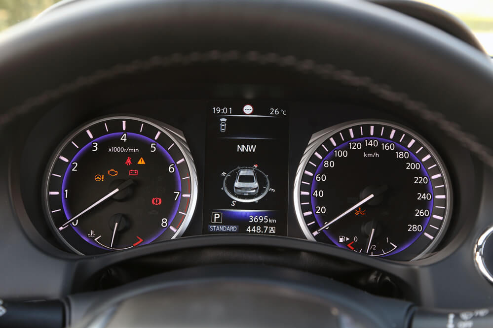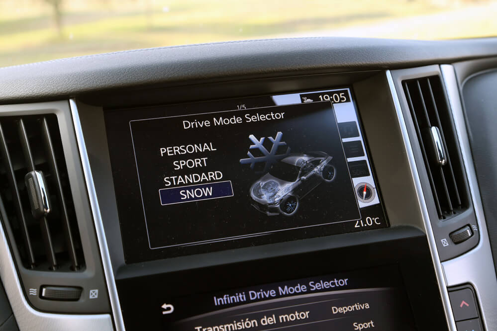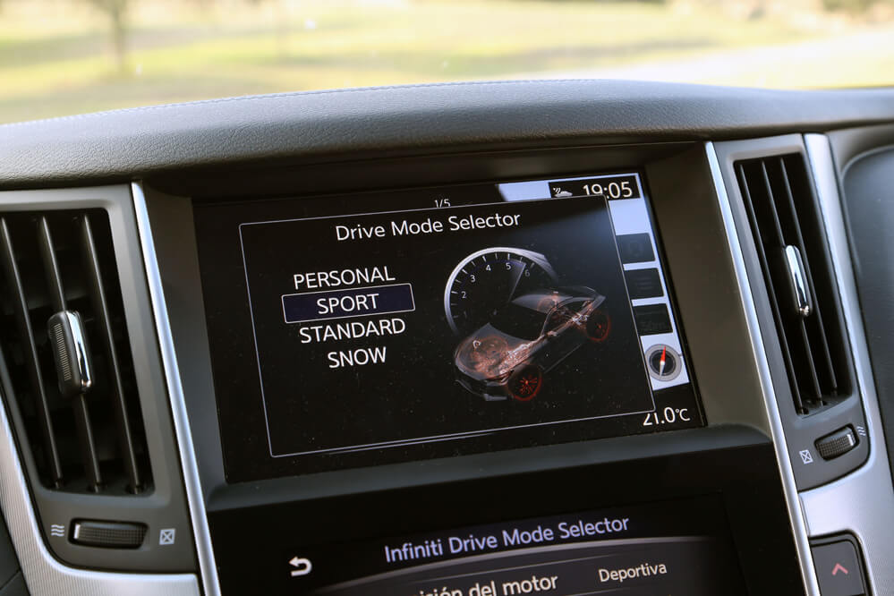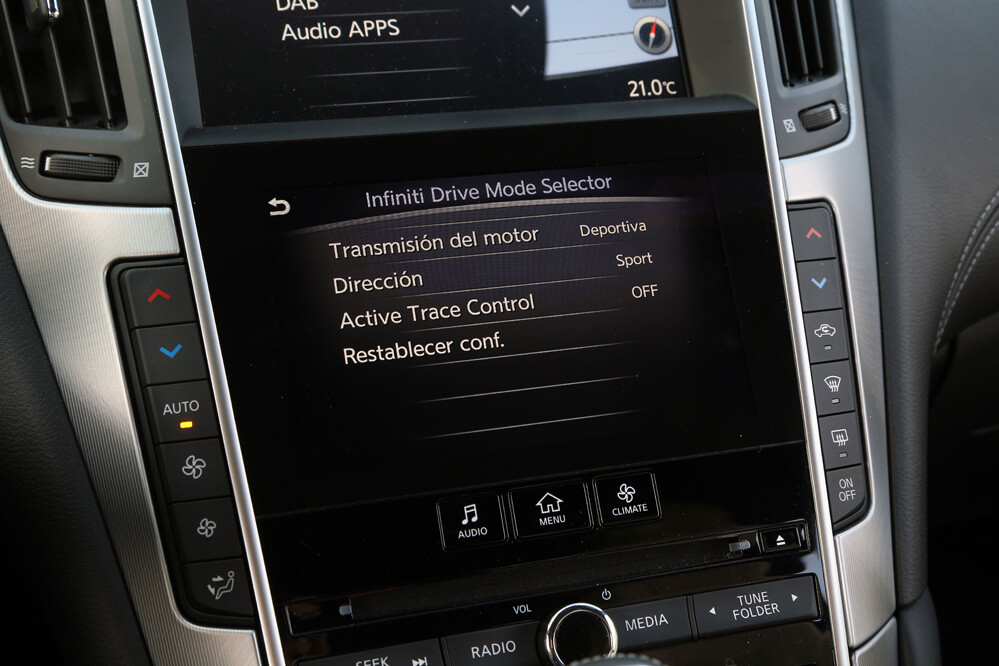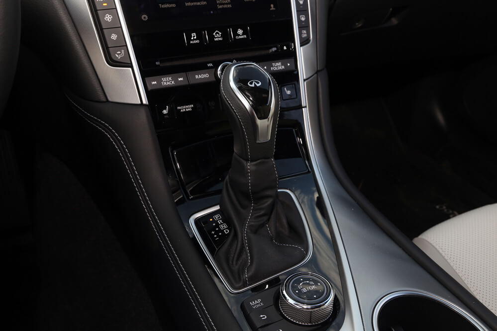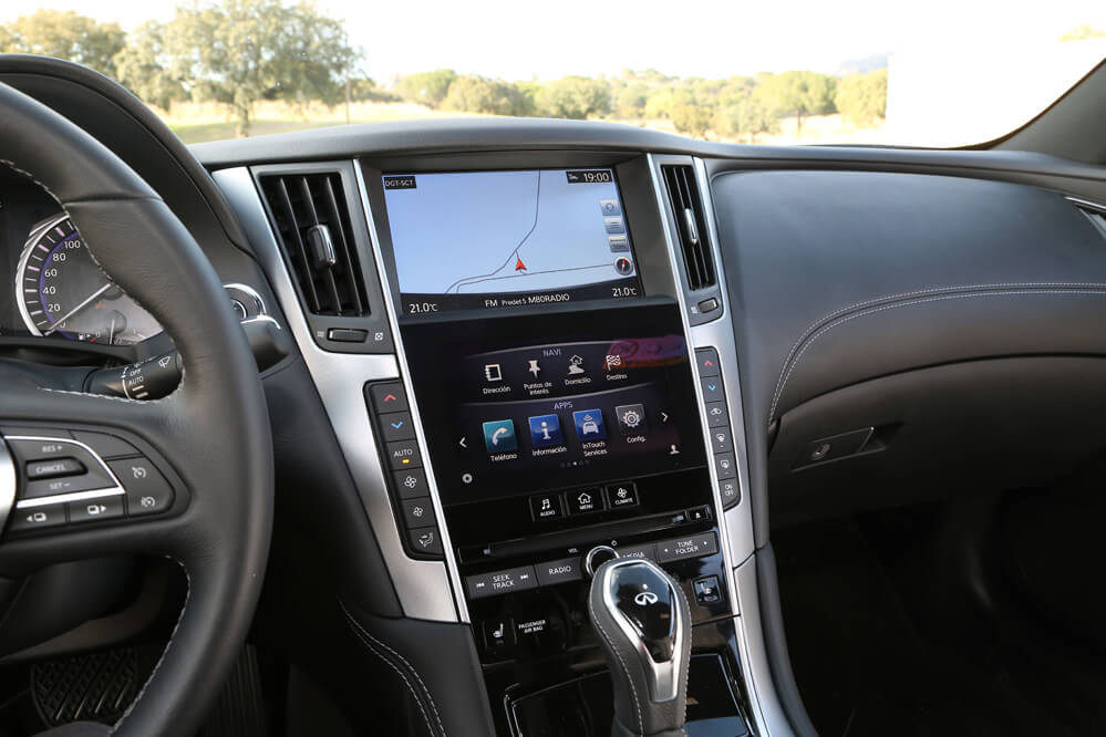 Dentro también hallo un gusto exquisito por los detalles; solo hay que descubrir el tirador de la puerta o la forma del asidero que emana de los apoyabrazos laterales. También llama poderosamente la atención su consola central en negro brillante compuesta por dos pantallas táctiles, estructura denominada Infiniti InTouch: la superior es de 8” y está reservada al navegador, mientras que la inferior, de cristal y de 7”, complementa al sistema de navegación, pero también hace la función del equipo multimedia y del climatizador. A diferencia de otros fabricantes, todas las funciones, a excepción del aire acondicionado, que se activa desde la pantalla, se pueden manipular mediante los botones repartidos por la consola. Por este motivo, cosa que agradezco, no es necesario navegar por el menú de las pantallas para cambiar de función, algo que obliga al conductor a quitar la vista de la carretera. También es verdad que alguno está a desmano, como el encendido y apagado del climatizador o los del sistema encargado de desempañar la luna delantera y trasera.